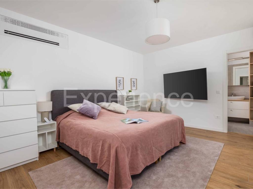 impressionante camera da letto principale con cabina armadio, bagno privato e accesso a un spazioso balcone con vista panoramica sul mare.