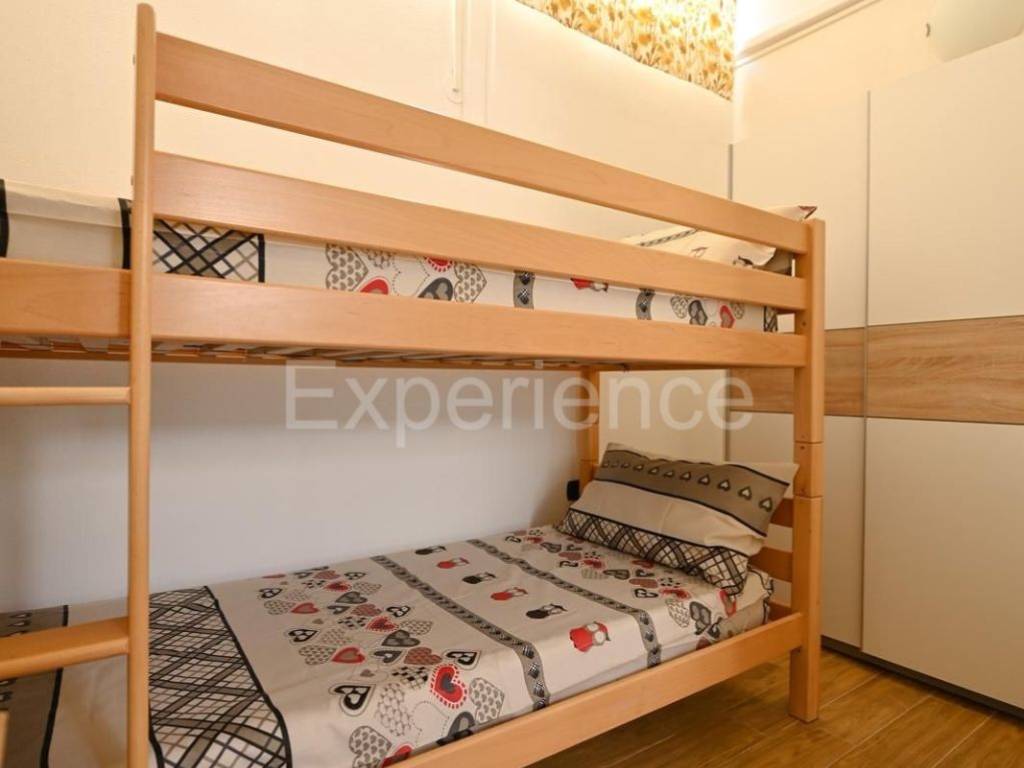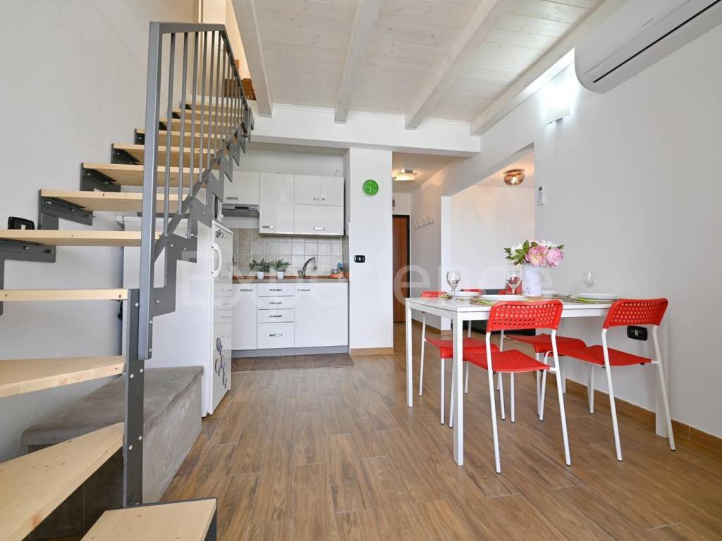 L'appartamento si sviluppa su due piani. Il piano inferiore comprende corridoio, una moderna cucina con zona pranzo, balcone chiuso, soggiorno e bagno. Il balcone chiuso aggiunge ampiezza alla zona giorno, consentendo un'abbondanza di luce naturale, aumentando la sensazione di ariosità degli spazi e offrendo una splendida vista mare dal comfort degli interni. Al piano superiore sono situate due camere da letto.