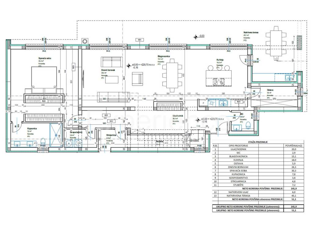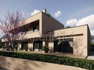 Al piano terra si trova il corridoio, uno spazio open space che unisce la cucina, sala da pranzo e soggiorno, dove ampie aperture vetrate consentono molta luce naturale e una connessione continua con l'esterno. Dal soggiorno si accede ad una terrazza coperta (45 m) con cucina estiva integrata, un angolo ideale per godersi le miti serate mediterranee. Questo piano comprende anche una spaziosa camera da letto (30,30 m) con guardaroba e bagno (7,80 m), locale tecnico, lavanderia, deposito e bagno per gli ospiti.