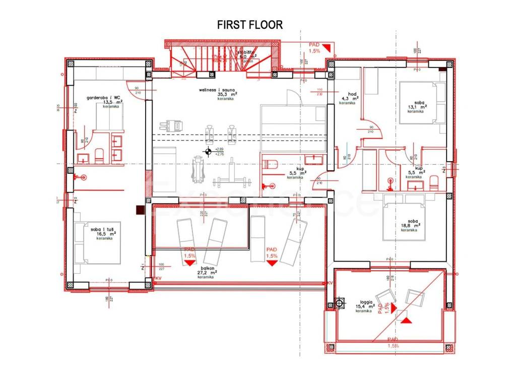 Al primo piano si trova wellness con sauna, il luogo perfetto per rilassarsi, tre spaziose camere da letto, ciascuna con il proprio bagno e accesso al balcone.