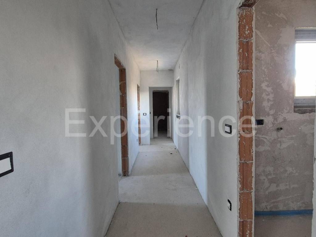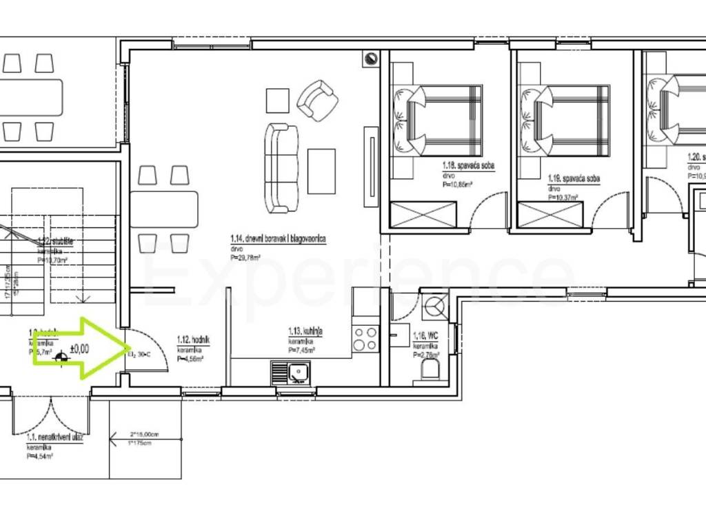 L'appartamento è situato al piano terra dell'edificio residenziale e copre una superficie netta di 94.87 m (lordi 99.78 m). Comprende: corridoio, spazioso soggiorno collegato alla cucina e alla sala da pranzo con accesso alla spaziosa terrazza coperta (9,82 m), tre camere da letto, bagno e toilette.