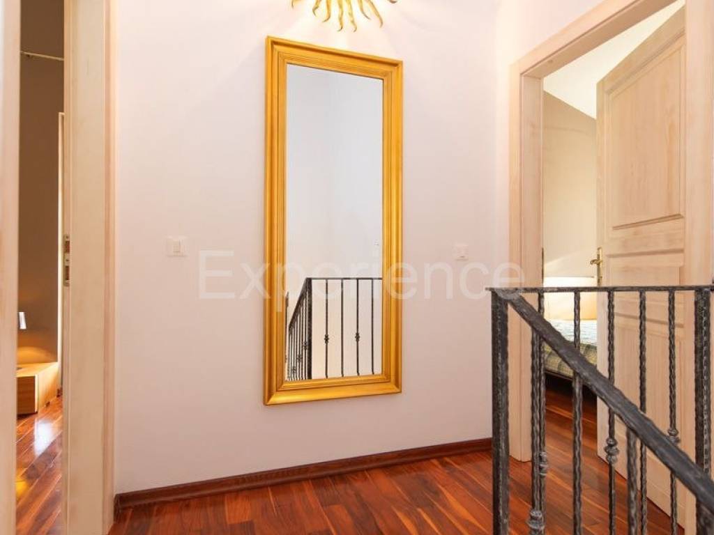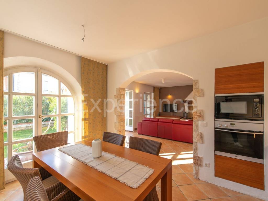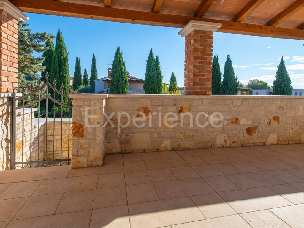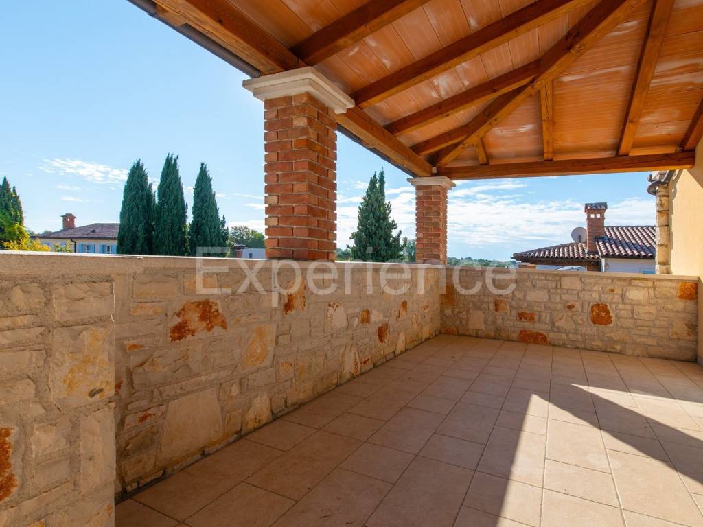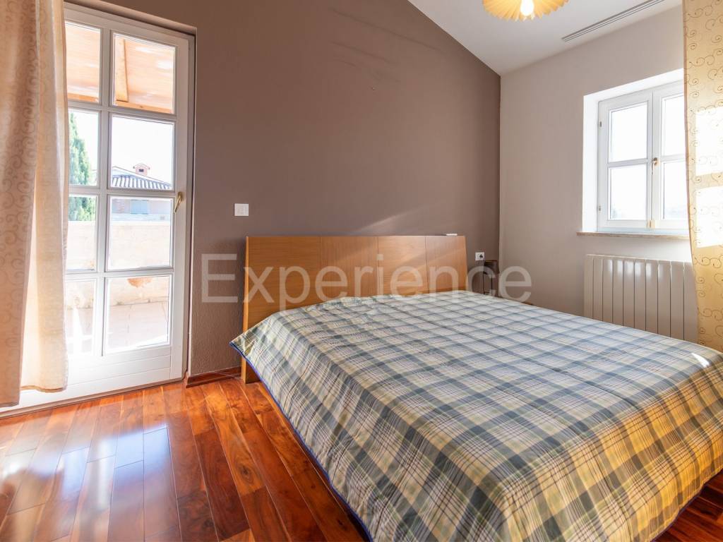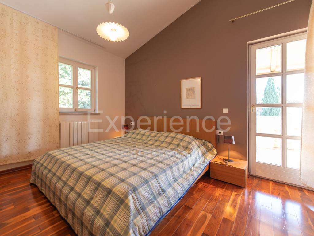 In una posizione tranquilla non lontano da Parenzo e a solo 1 km dal mare si trova una bella casa bifamiliare. È stata costruito nel 2006., i proprietari lo hanno rinnovata nel 2021. e la mantengono continuamente. L'hanno comprata e utilizzata esclusivamente per le loro esigenze, la casa non è mai stata affittata! Ha un totale di 155,55 m con terrazze (135 m di spazio chiuso), su un terreno di 367 m. Il giardino è di 200 m. La casa è composta da un piano terra e un primo piano, ha uno stile rustico-mediterraneo. Al piano terra troviamo un disimpegno, una camera da letto, un bagno, un ampio soggiorno con camino e una cucina con sala da pranzo. Dal soggiorno e dalla cucina si accede al terrazzo coperto dove si trova un altro camino e tavolo da pranzo, e al giardino. Al piano superiore ci sono altre due camere da letto, ciascuna con il proprio bagno, che condividono un ampio terrazzo coperto.