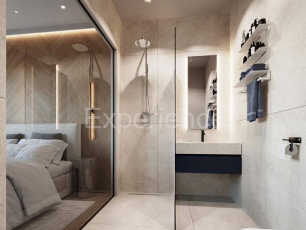Nelle vicinanze di Parenzo - ca. 3 km dal mare, in un ambiente molto tranquillo è in vendita un lussuoso appartamento in una nuova costruzione, con la superficie netta complessiva di 152.13 m. L'appartamento è situato al piano terra di un intimo edificio residenziale di sole 4 unità abitative. Si compone di due piani. Il primo livello del appartamento si trova al piano terra dell'edificio e comprende: corridoio, spazioso soggiorno, cucina e sala da pranzo con accesso al terrazzo coperto (12.82 m), camera da letto con bagno e lavanderia con toilette. La scala interna conduce al piano superiore dell'appartamento, anch'esso al primo piano dell'edificio, dove si trovano due camere da letto, ciascuna con proprio bagno e accesso al balcone (10.60 m). Dal balcone si estende la vista sul mare.
