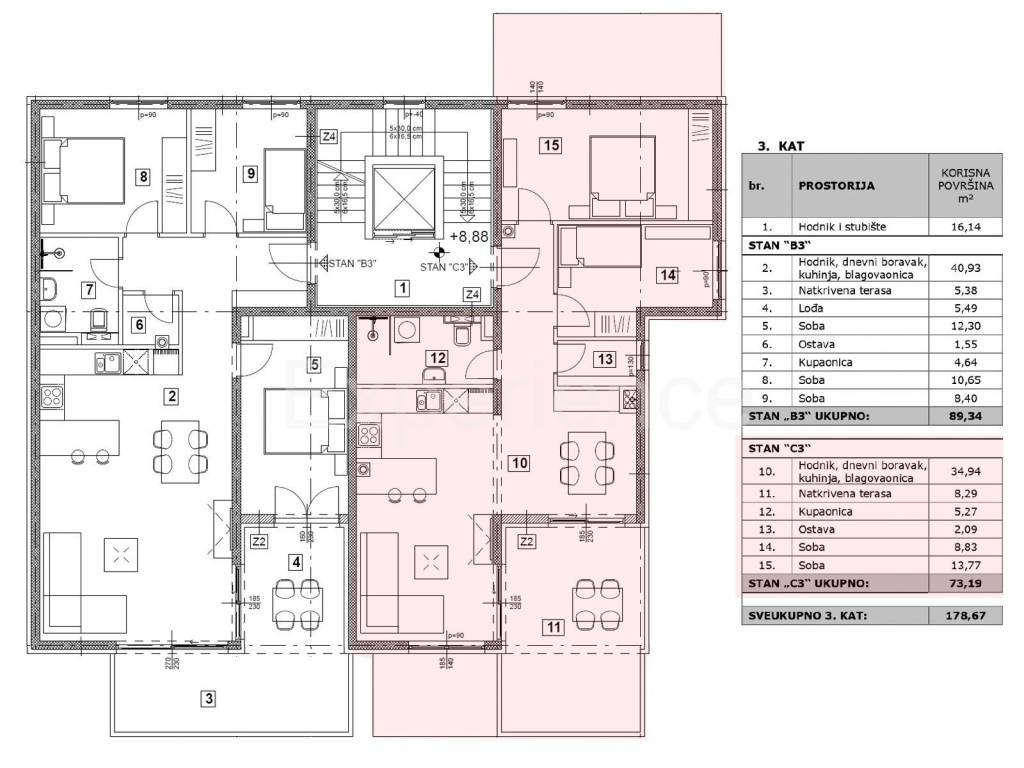 L'appartamento comprende anche una terrazza sul tetto (79,41 m) sopra l'appartamento con vista sul paesaggio circostante, un deposito (3,84 m) al piano terra dell'edificio e un posto auto di fronte all'edificio.