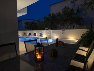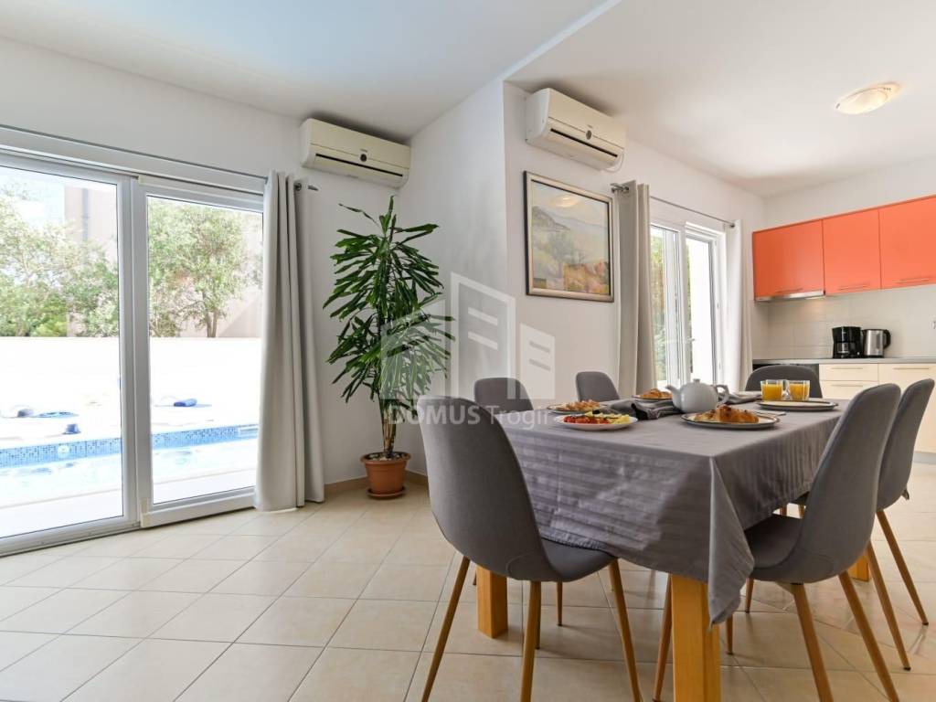 The apartment covers 58 square meters. It consists of 2 bedrooms, bathroom and toilet, hallway and living room with kitchen and dining room. The apartment has a private pool, a garden and a tavern that covers 40 square meters.