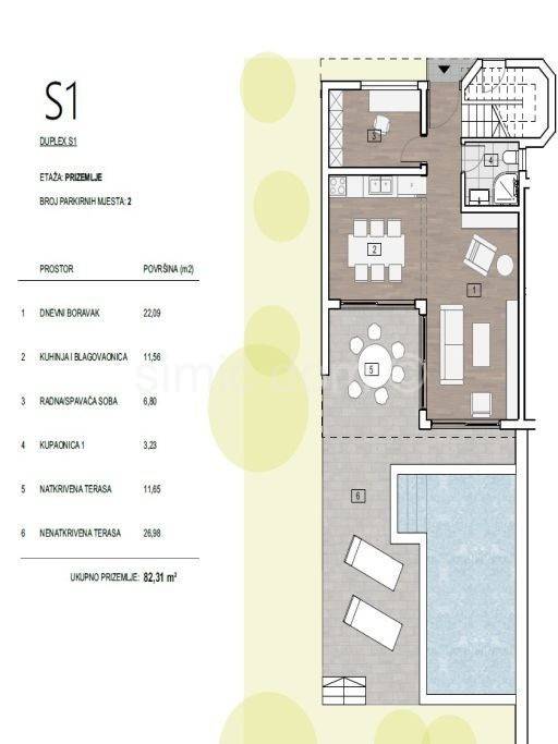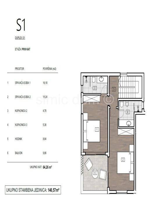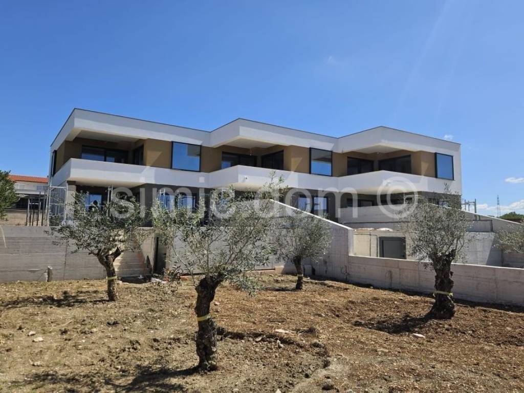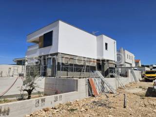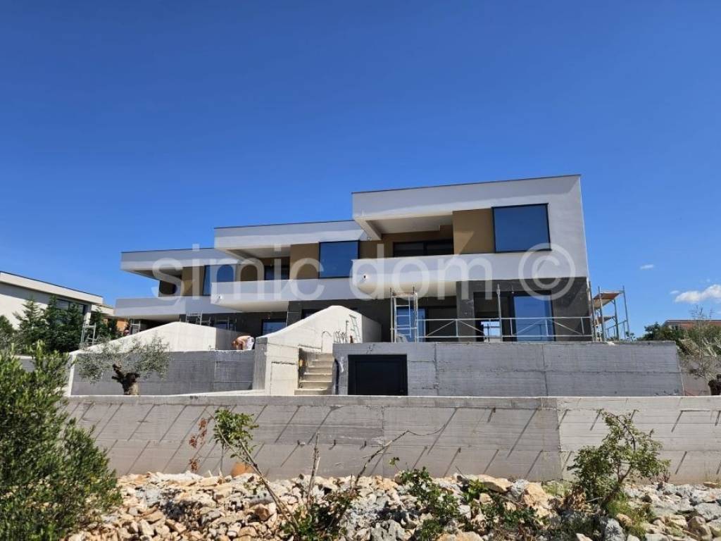 A modern terraced house is for sale located above Primosten in a quiet street. House S1 has a total area of 146.57 m2 and extends over two floors. The ground floor, which is 81 m2 in size, has a hallway, a small bedroom that can also be used as a study, a bathroom, a kitchen with a dining room and a living room that leads to a paved terrace with a private swimming pool and sunbathing area and a seating area for enjoying summer evenings. On the first floor, 64 m2 in size, there are two bedrooms, two bathrooms and a balcony with a beautiful view. A house with an almost identical layout, 145.18 m2 in size, is also for sale for 620,000. The property is located in an excellent location, which ensures peace and privacy, and is also close to all necessary amenities such as shops, restaurants and beaches. The houses are built according to extremely high-quality criteria and are sold on a turnkey basis. It is possible to park two cars in the garden. Expected completion is fall 2025.