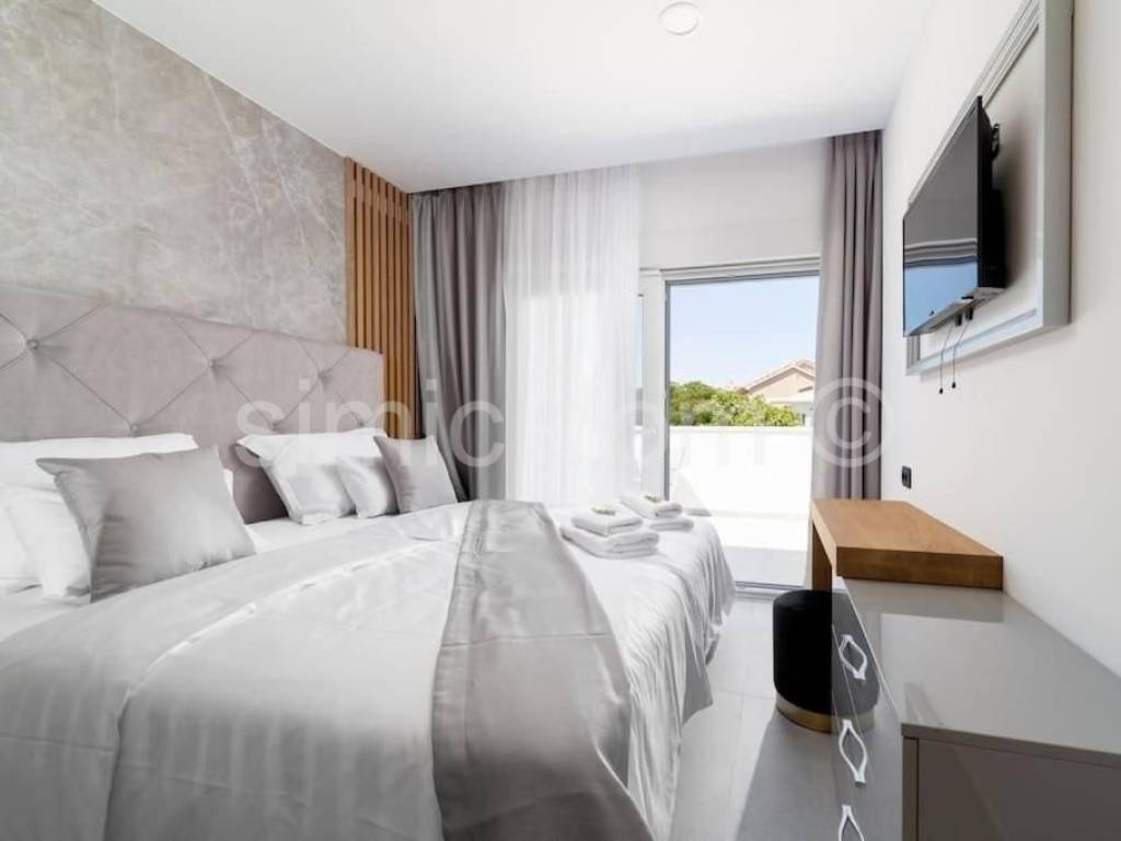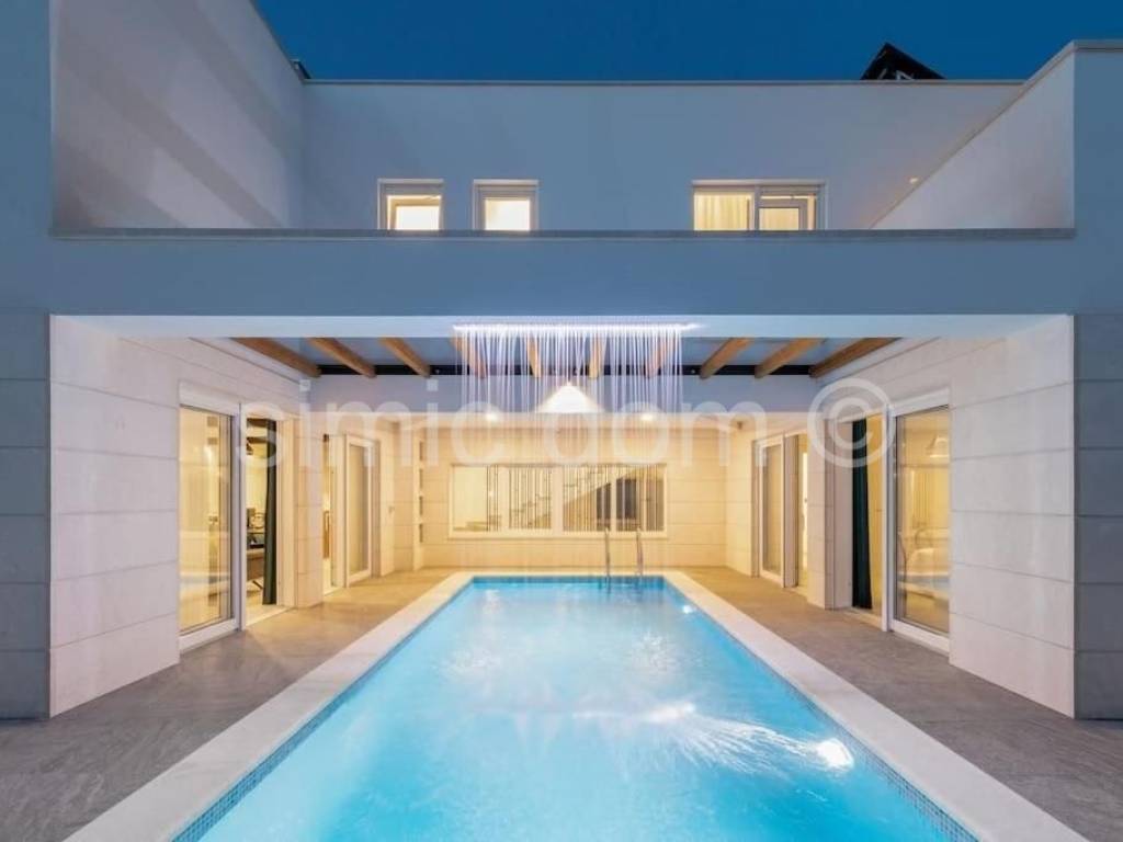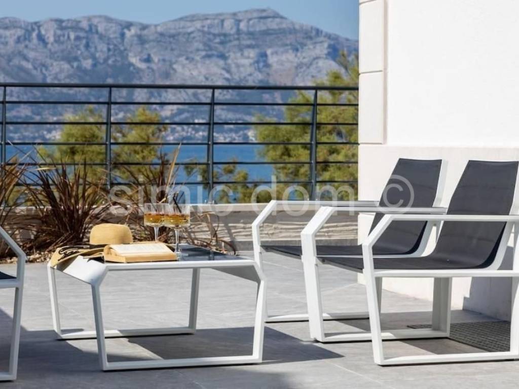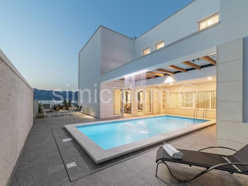 We are mediating the sale of a beautiful villa located first row to the sea in the beautiful and peaceful bay of Povlja on the island of Brac. This luxury villa has a total area of 304 m2 and is built on a plot of 444 m2. It is spread over three floors; basement, ground floor and first floor. It consists of a total of 5 bedrooms and 6 bathrooms. In the basement there is a bathroom, gym and an entertainment room with billiards and darts. The second level, ground floor, consists of a bedroom, bathroom, kitchen with dining room and living room that provide access to 3 open and partially covered terraces. on the terraces on the ground floor there is a swimming pool with a heating system and a sunbathing area and a barbecue. The first floor consists of 4 bedrooms, each with an en-suite bathroom and 2 balconies with panoramic views of the surroundings and the sea. The villa is sold fully furnished and equipped with high quality, with underfloor heating and fully air-conditioned. The plot itself is fenced, and within it there is also space for outdoor parking. What gives this property an additional advantage is the intimacy provided by the excellent and quiet location and the proximity of numerous sandy beaches, as well as other amenities. The first larger town is a ten-minute drive away, and it takes just under half an hour to drive to Brac airport. Ownership is in order.