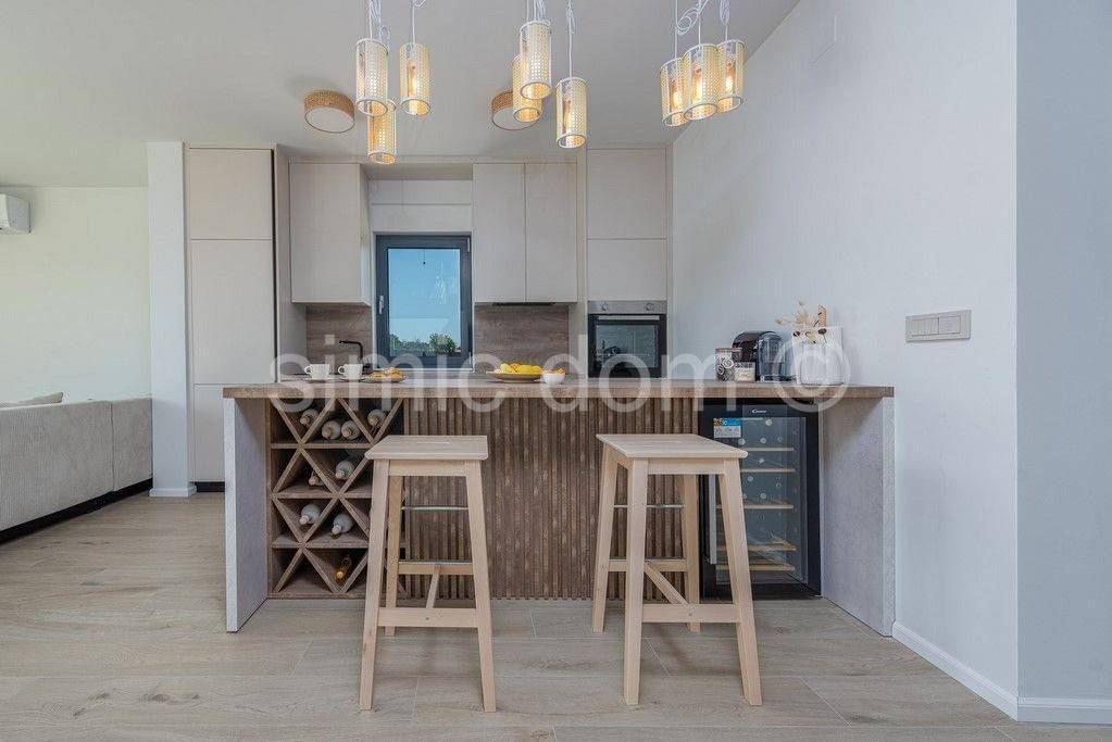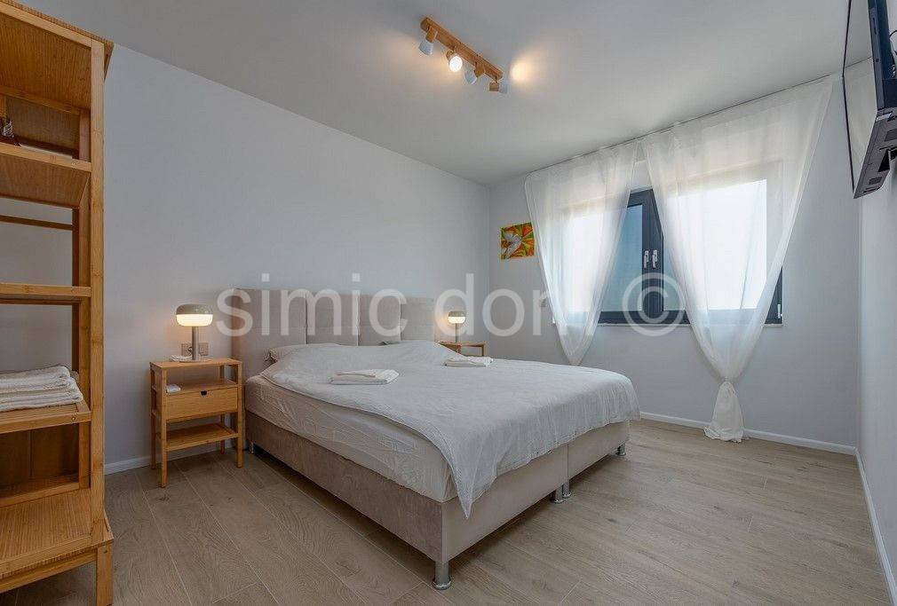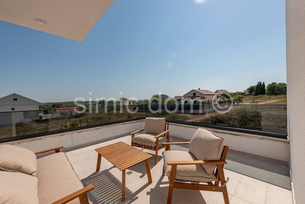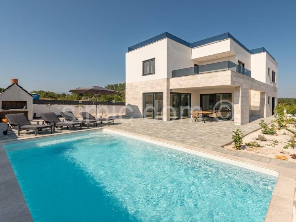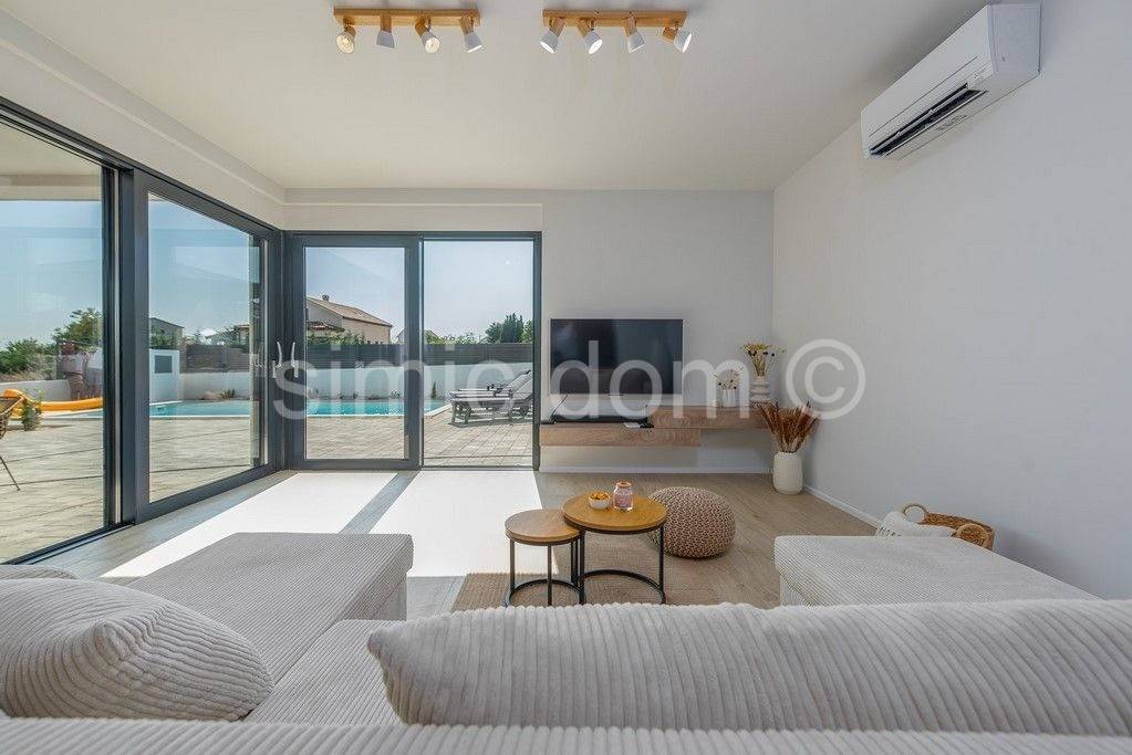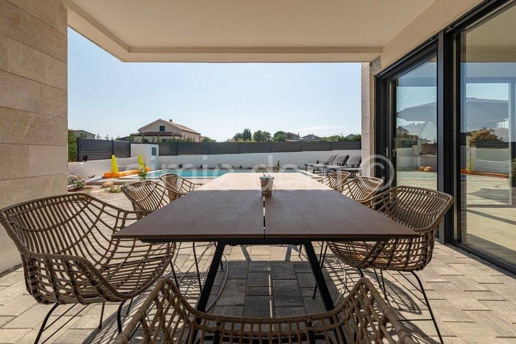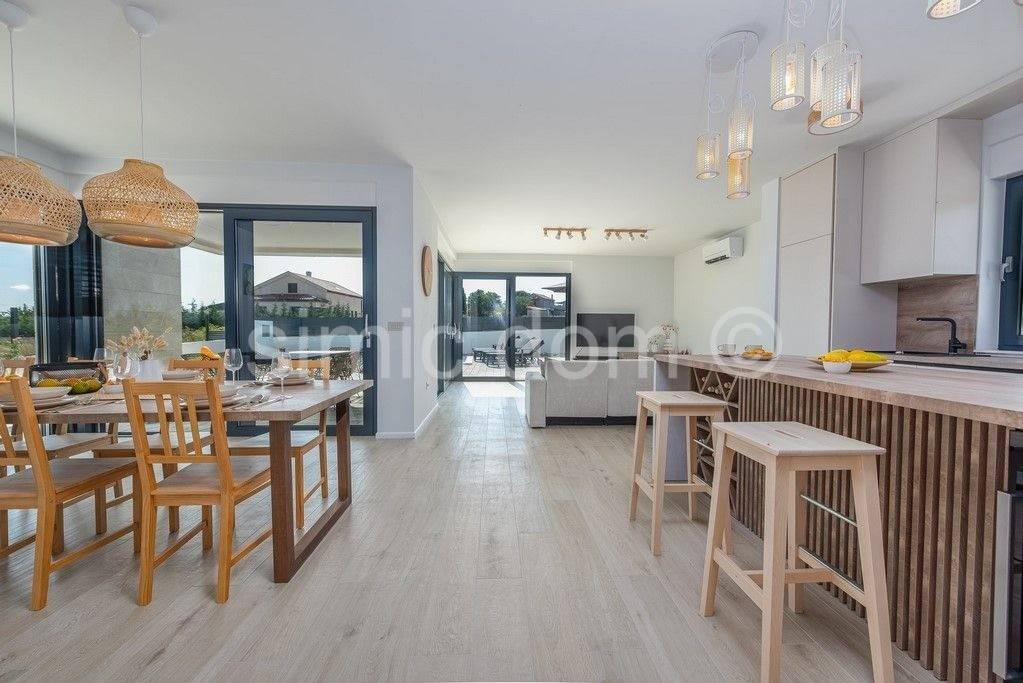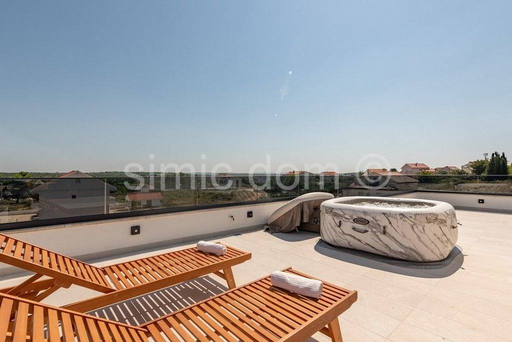 For sale is a beautiful, newly built and furnished house in the area of Poljica Brig, not far from Zadar. The house was built in 2024 and is located on a plot of 518 m2. It has a total area of 220m2 and consists of two floors. The house is an ideal combination of modern design with a touch of warmth of traditional stone and wooden materials. The house has a total of 4 bedrooms and 3 bathrooms. The living room together with the kitchen and dining room is located on the ground floor of the house and has direct access to a beautiful, paved terrace with a swimming pool, sun deck, outdoor dining area and a beautiful garden decorated with Mediterranean plants. There is also a gym on the ground floor. The house is full of beautiful terraces on each floor and large sliding rocks, which allows for natural lighting and a beautiful view of the surroundings all day long. On the large roof terrace there is a jacuzzi and a sunbed. The house is superbly equipped, there are air conditioners in all rooms, underfloor heating throughout the house, an automatic chemical dispenser in the pool, which is heated, irrigation in the garden, the house has hot water via a heat pump, the carpentry is fitted with mosquito nets and electric shutters, and there is also video surveillance. It is possible to park 3 cars in the garden. Ownership in order.