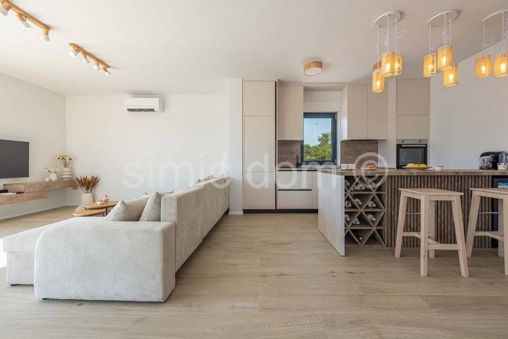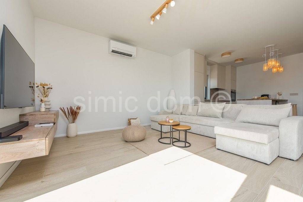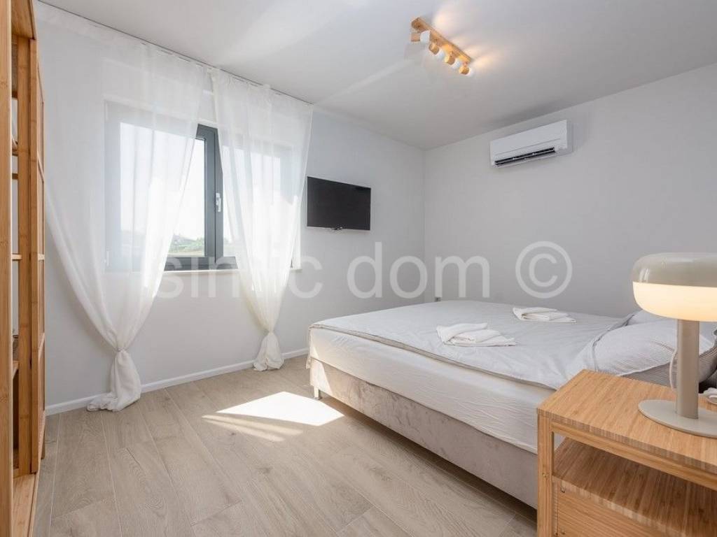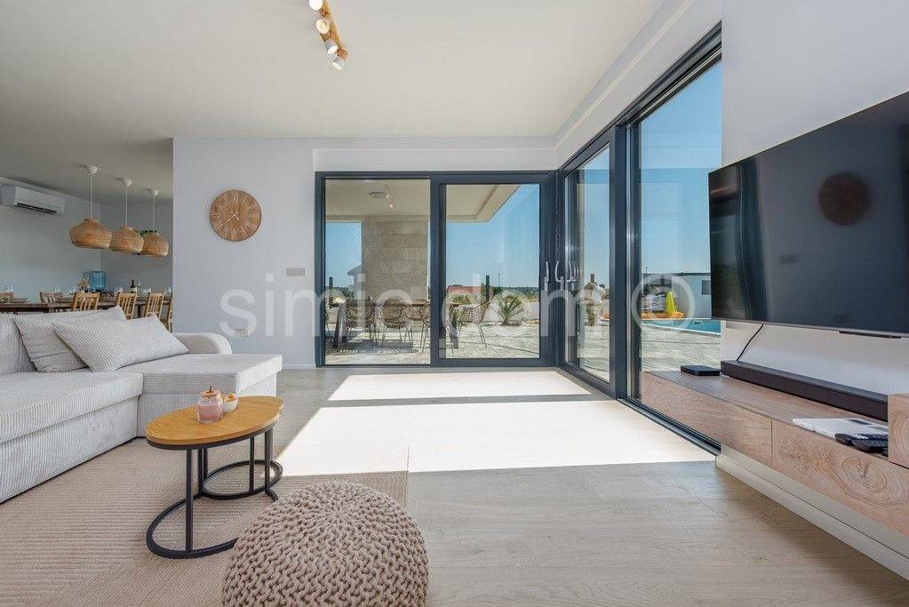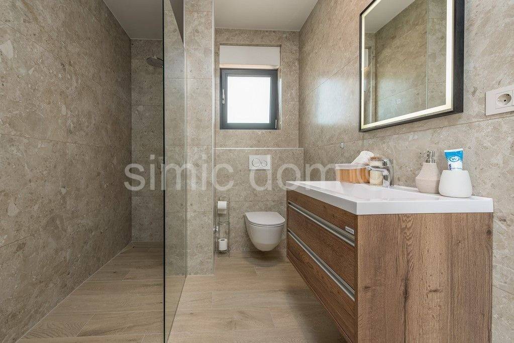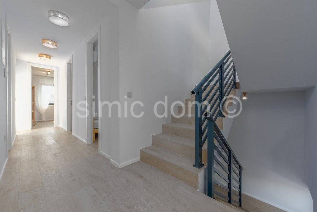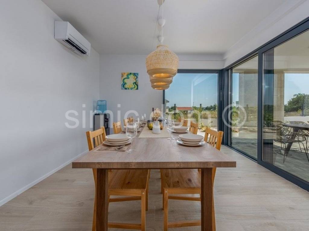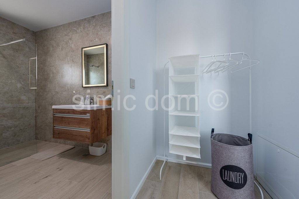 For sale is a beautiful, newly built and furnished house in the area of Poljica Brig, not far from Zadar. The house was built in 2024 and is located on a plot of 518 m2. It has a total area of 220m2 and consists of two floors. The house is an ideal combination of modern design with a touch of warmth of traditional stone and wooden materials. The house has a total of 4 bedrooms and 3 bathrooms. The living room together with the kitchen and dining room is located on the ground floor of the house and has direct access to a beautiful, paved terrace with a swimming pool, sun deck, outdoor dining area and a beautiful garden decorated with Mediterranean plants. There is also a gym on the ground floor. The house is full of beautiful terraces on each floor and large sliding rocks, which allows for natural lighting and a beautiful view of the surroundings all day long. On the large roof terrace there is a jacuzzi and a sunbed. The house is superbly equipped, there are air conditioners in all rooms, underfloor heating throughout the house, an automatic chemical dispenser in the pool, which is heated, irrigation in the garden, the house has hot water via a heat pump, the carpentry is fitted with mosquito nets and electric shutters, and there is also video surveillance. It is possible to park 3 cars in the garden. Ownership in order.