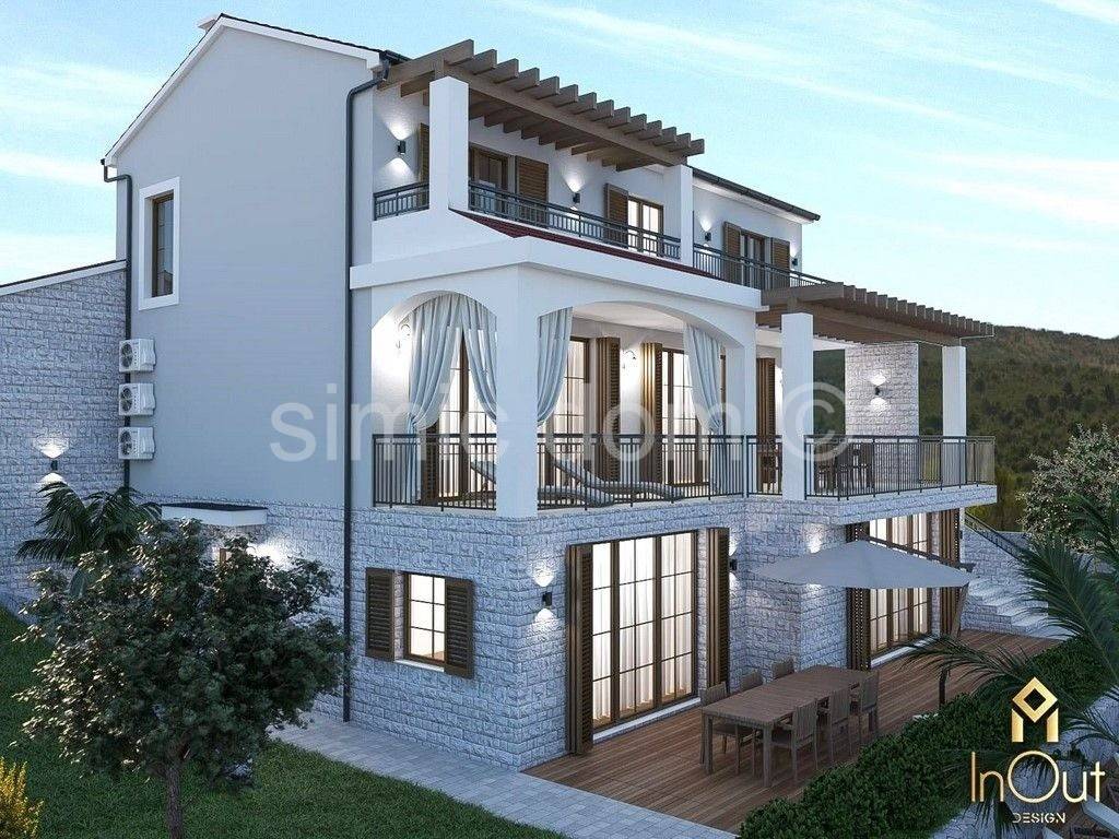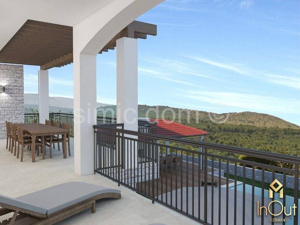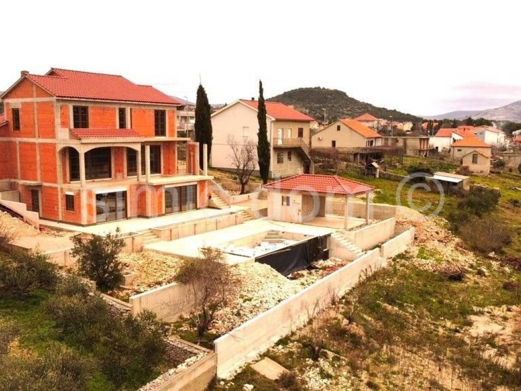 For sale is an unfinished family house with a swimming pool located in Vrpolje, a quiet place 5 minutes' drive from Sibenik, and the nearest beach is 5 km away. The house is located on a large plot of over 1000m2 and has a net usable area of 376m2, which extends over three floors. The souterrain has an area of 115.91 m2 and consists of a hallway, 2 storage rooms, a bathroom, a cellar, and on this level there are 4 additional rooms, i.e. additional storage, and one can be used as an additional bedroom. There is also a summer kitchen with large glass walls. The ground floor of 152.91 m2 consists of a garage for two cars, a toilet, 2 storage rooms, a living room together with a kitchen and a dining room, which leads to a beautiful terrace with a view of the hills and beautiful nature. On the first floor of 107.13 m2, there is a hallway, 3 bedrooms, 2 bathrooms, a wardrobe, a laundry room and two terraces. The spacious garden contains an additional building of 19 m2 with a toilet, storage room and terrace, and there is also a large swimming pool. The works in the exterior space have been brought to the final stage, and the installations, plaster, glaze, suspended ceilings (Knauf) and most of the ceramics have been completed inside the building. Also, underfloor heating for the heat pump was prepared. Preparation of air conditioning is in progress. The price of the house in this phase is 975,000.00. There is a possibility of an agreement with the seller for the full completion of the house. This property is great for a buyer who wants a luxurious, spacious property in a quiet hinterland, within easy reach of beautiful Dalmatian towns such as Sibenik, Primosten and many surrounding beaches.