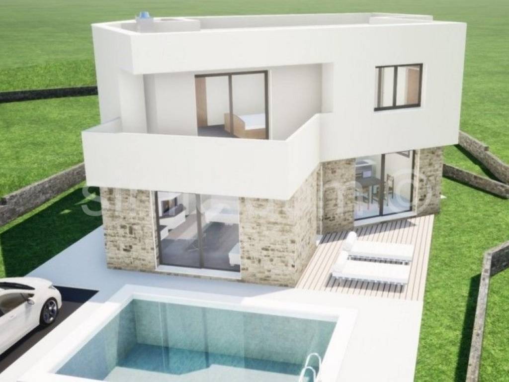 For sale is a beautiful family house with a swimming pool, not far from Sibenik. This is a newly-built detached house, built on a plot of 460m2. It is located in a quiet street, in a very nice neighborhood, not far from the Solaris hotel complex, and is only 400m from a beautiful pebble beach. The house has a total floor area of 167m2 and consists of a ground floor and the first floor. On the ground floor there is a living room with a kitchen and dining room in one space, one bedroom with a bathroom and wardrobe, a storage room and a guest toilet. From the living room you can access a covered terrace with a sun deck and a swimming pool. The bedroom has access to a smaller covered terrace. Internal stairs lead to the first floor with three more bedrooms, one of which has its own bathroom and access to a large terrace with a view of the sea, a wardrobe and an additional bathroom. There are also two smaller terraces. It is possible to park two cars in the exterior. This beautiful house boasts modern design, quality construction and an excellent location near the sea and not far from Sibenik. It is ideal for a quiet family holiday, but also as a house to live in. The house will be ready for occupancy during the summer.