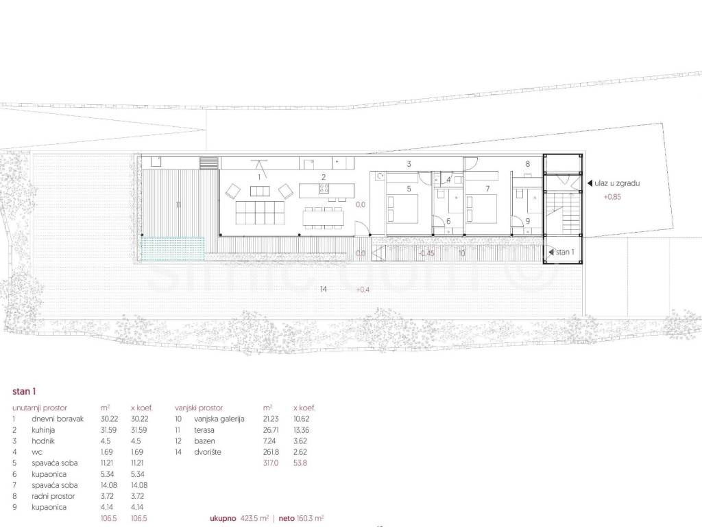 We mediate in the sale of a top-quality, highly luxurious and very spacious two-bedroom apartment in a new building in one of the most beautiful and peaceful locations on the south side of the island of Korcula. This is a smaller urban villa that will have only three apartments, and this apartment is located on the lowest floor. Its net area is 160m2, and it consists of a hallway, two bedrooms (each with its own bathroom, and one with a work area), toilet, kitchen and an exceptional living room. The exterior space of the apartment, which opens from the living room, includes an outdoor gallery, a terrace, a yard and a swimming pool. The building is being built in an innovative, sustainable and environmentally friendly way (CLT system), while the final equipment of the apartment will include a smart home system, smart glass film for glass walls, a system with a heat pump from a renowned manufacturer, underfloor heating, premium ceramics and sanitary ware. The location of this new construction, which is right next to the sea, guarantees incredible peace, privacy and a view of the sea, and the impressive outdoor space of each apartment provides a feeling of traditional outdoor living. Completion is planned for the fall of 2024. Ownership in order.