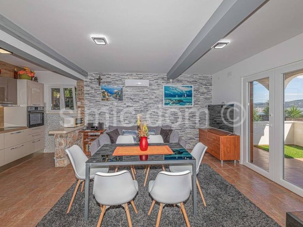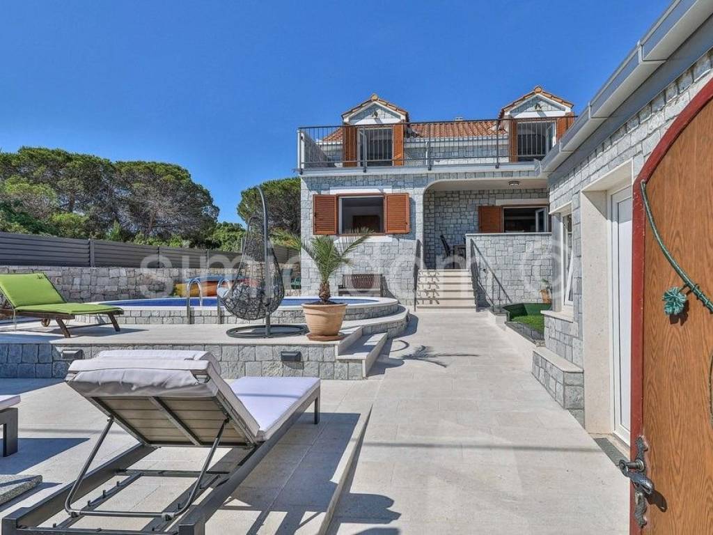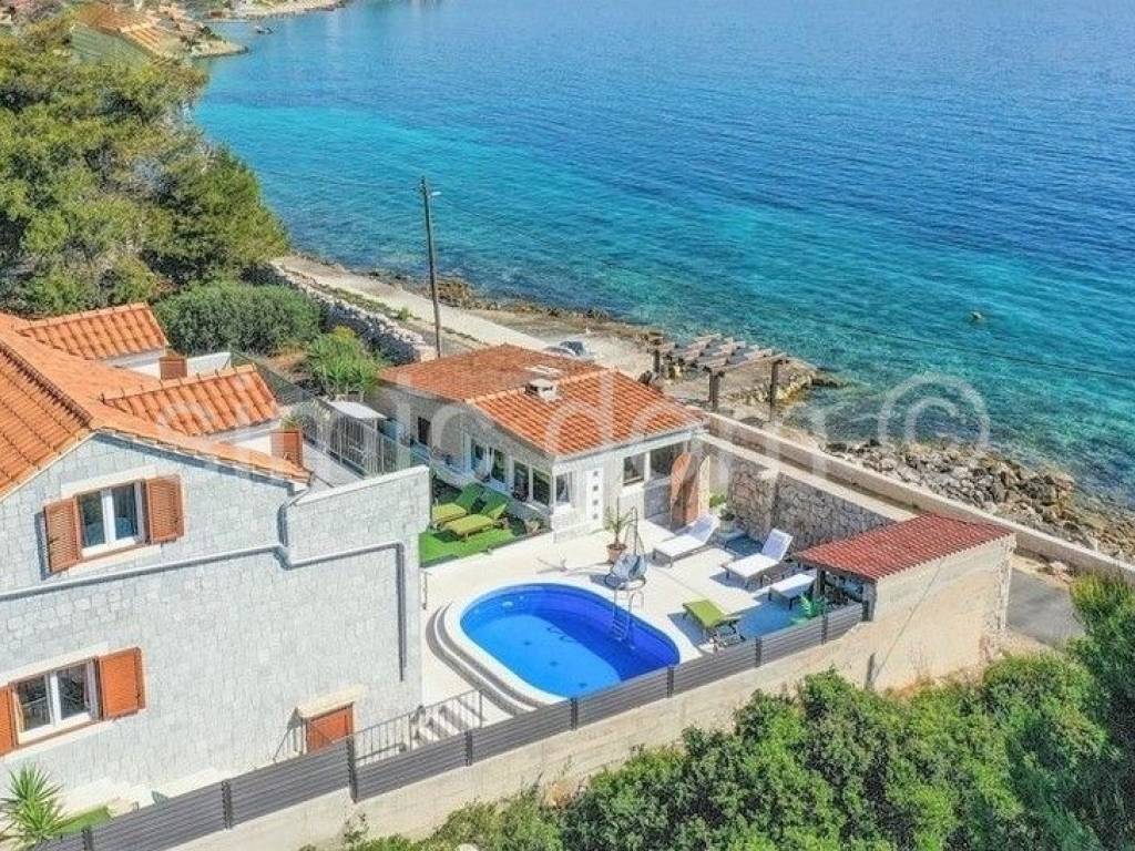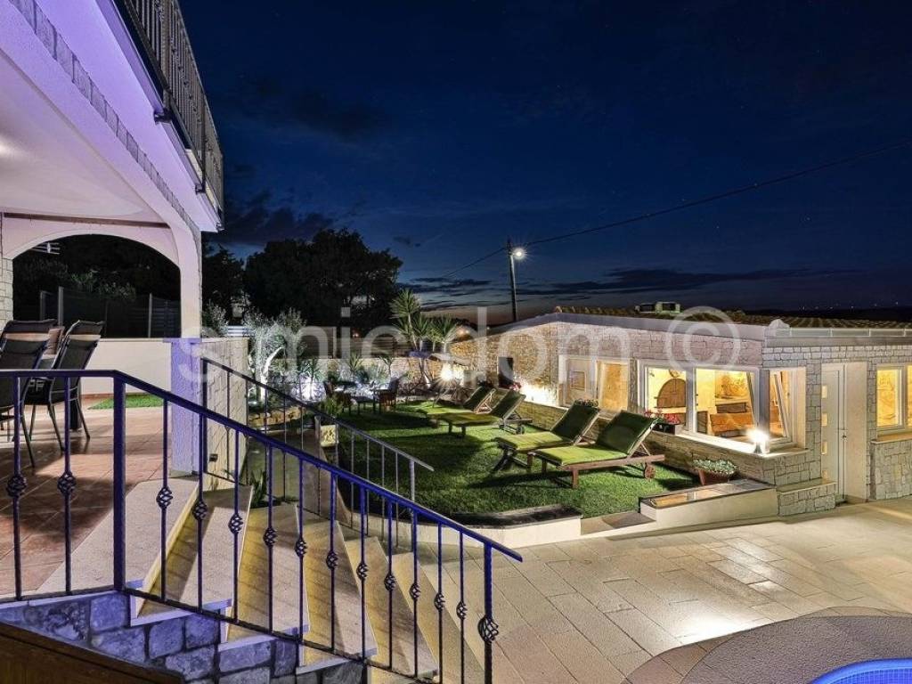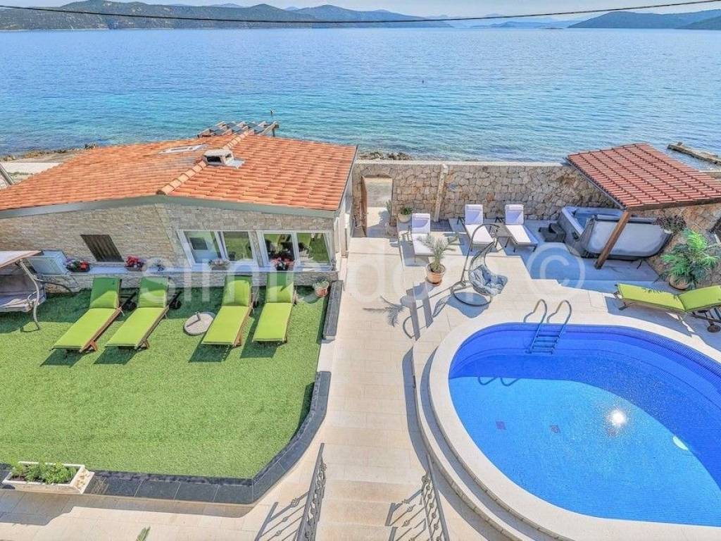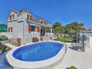 We mediate in the sale of an exclusive villa in the first row to the sea, on a beautiful island in the Trogir archipelago. Located in a quiet and private location, this property offers various opportunities to enjoy the summer months. In addition to the sea, you can enjoy swimming pool, jacuzzi, sun deck, sauna, and children can also play on a small playground right next to the house. The property consists of three detached buildings: the main house and two smaller units. The beautiful main house has a total area of 160m2, which extends to the basement, ground floor and first floor. It has 4 bedrooms, three bathrooms, a living room with a dining room and a kitchen. From the terraces on the ground floor and the first floor there is a wonderful view of the entire Trogir archipelago. Behind the main house there is an additional building with one bedroom, a kitchen and a bathroom. Within the beautiful garden there is a third smaller building of 49 m2 consisting of two bedrooms, a bathroom and a lounge. There are three parking spaces next to the house. This property is an ideal combination of privacy, nature and numerous amenities, offering an ideal vacation by the beautiful blue sea. Ownership in order.