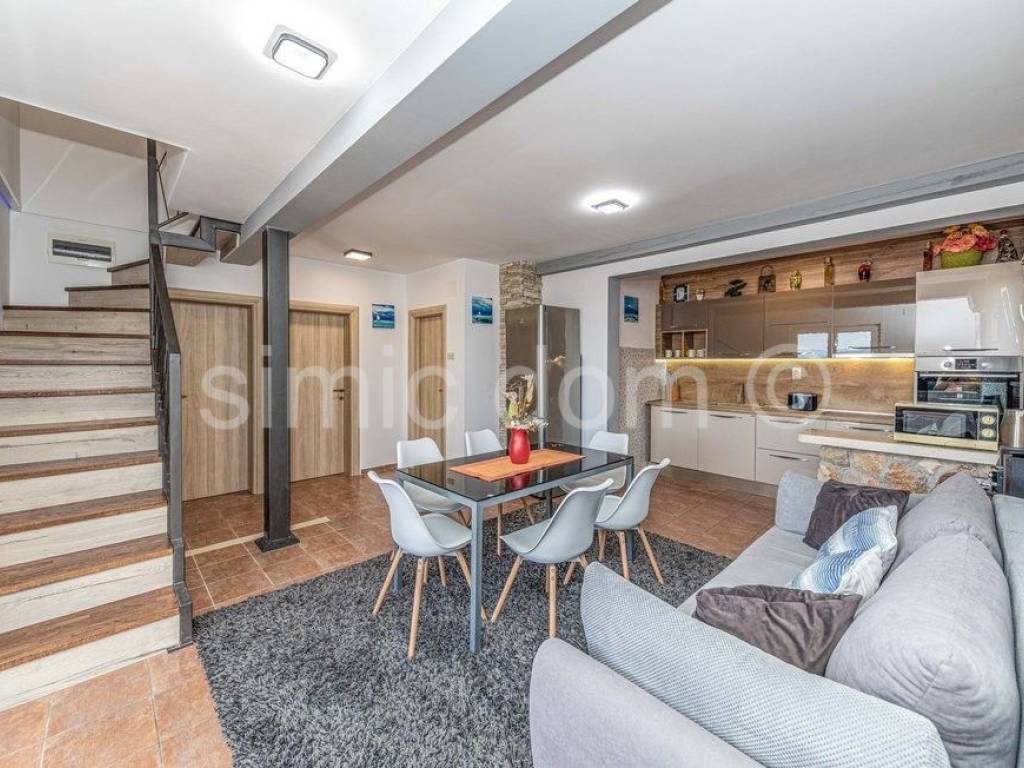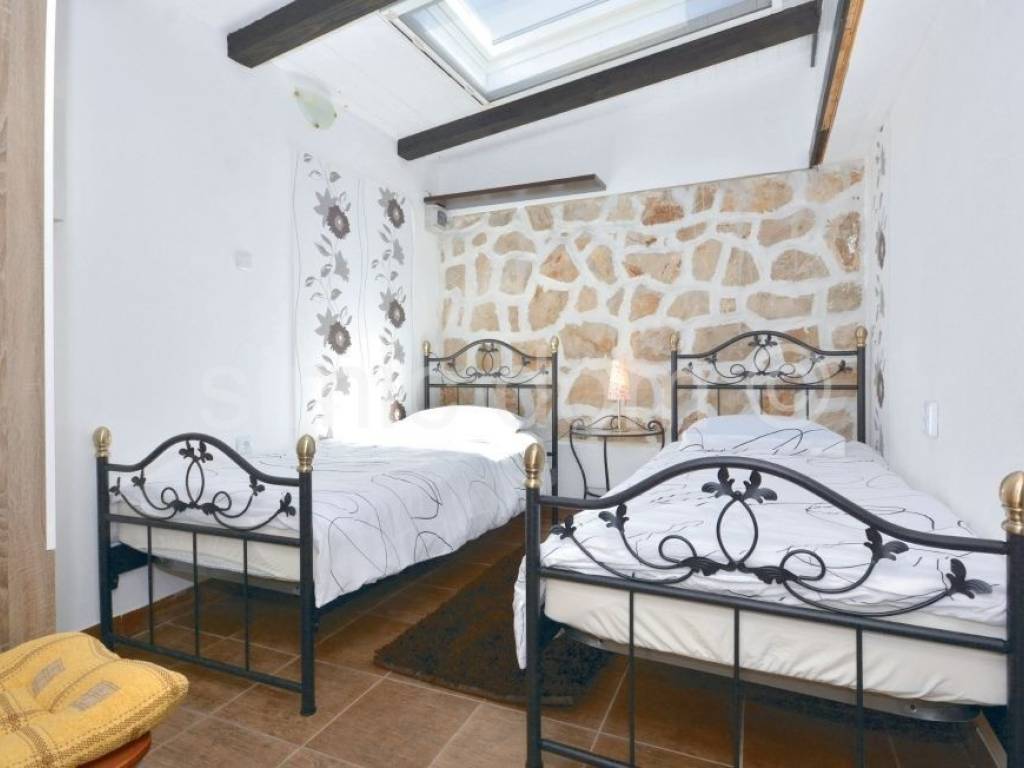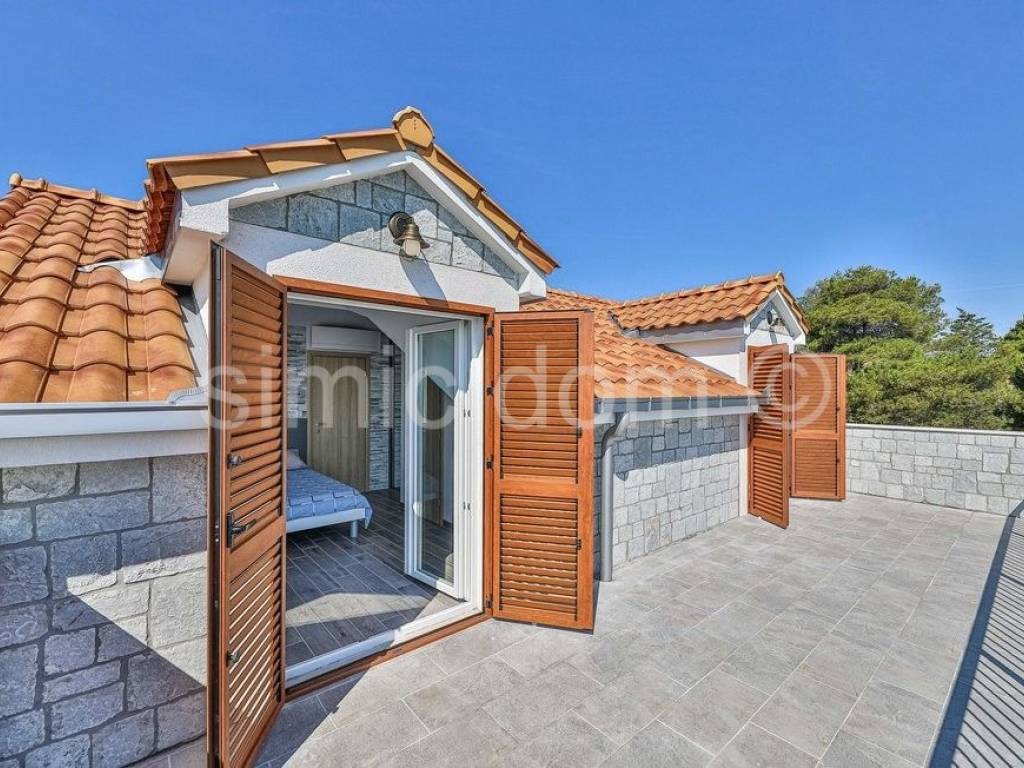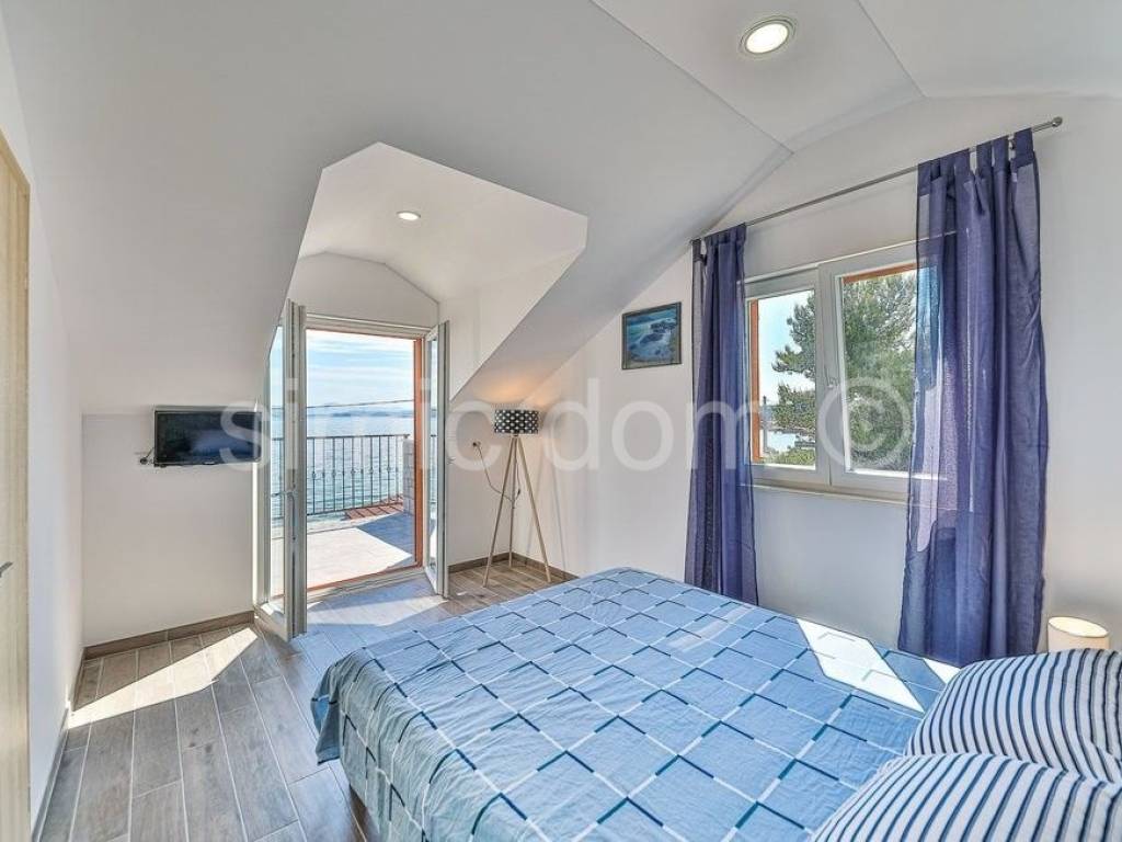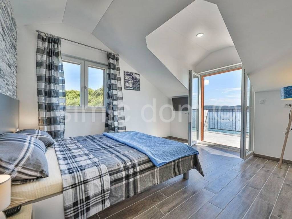 We mediate in the sale of an exclusive villa in the first row to the sea, on a beautiful island in the Trogir archipelago. Located in a quiet and private location, this property offers various opportunities to enjoy the summer months. In addition to the sea, you can enjoy swimming pool, jacuzzi, sun deck, sauna, and children can also play on a small playground right next to the house. The property consists of three detached buildings: the main house and two smaller units. The beautiful main house has a total area of 160m2, which extends to the basement, ground floor and first floor. It has 4 bedrooms, three bathrooms, a living room with a dining room and a kitchen. From the terraces on the ground floor and the first floor there is a wonderful view of the entire Trogir archipelago. Behind the main house there is an additional building with one bedroom, a kitchen and a bathroom. Within the beautiful garden there is a third smaller building of 49 m2 consisting of two bedrooms, a bathroom and a lounge. There are three parking spaces next to the house. This property is an ideal combination of privacy, nature and numerous amenities, offering an ideal vacation by the beautiful blue sea. Ownership in order.