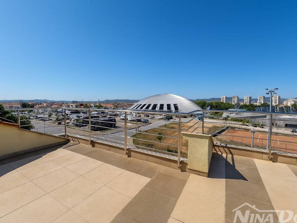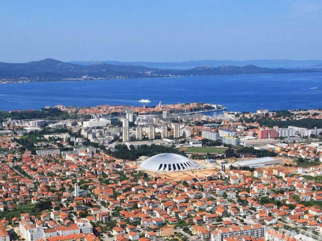 Soggiorno con accesso alla terrazza coperta (vista sulla città e sul centro sportivo Višnjik)