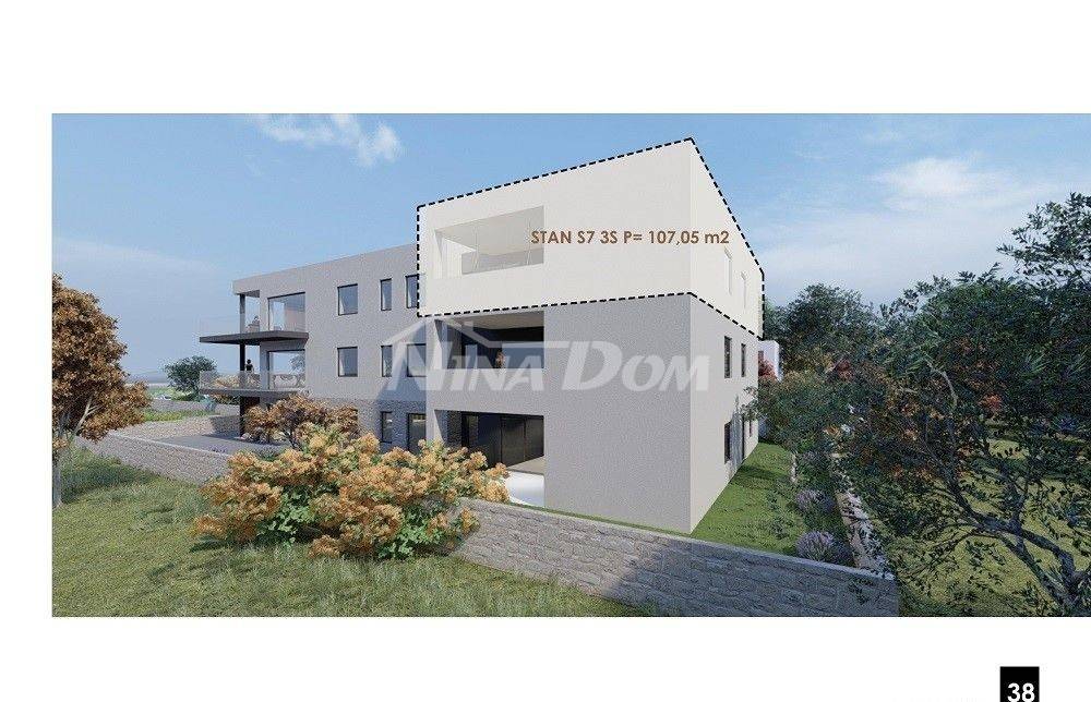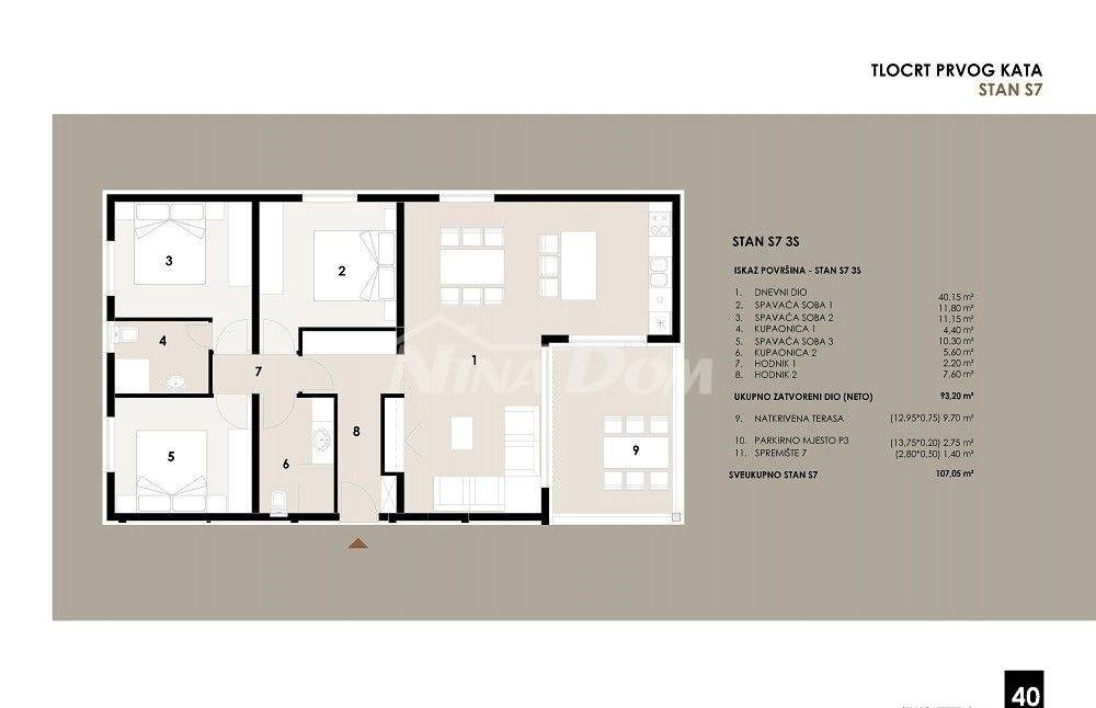 Apartman S7 smještena je na drugom katu i sastoji se od hodnika,dvije kupaone, tri spavaće sobe, kuhinje s dnevnim boravkom, natkrivenom terasom, ostava (spremište br,7) 2.80 m2.