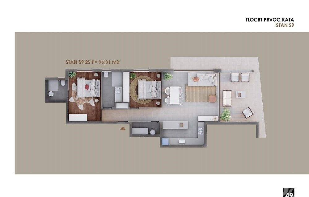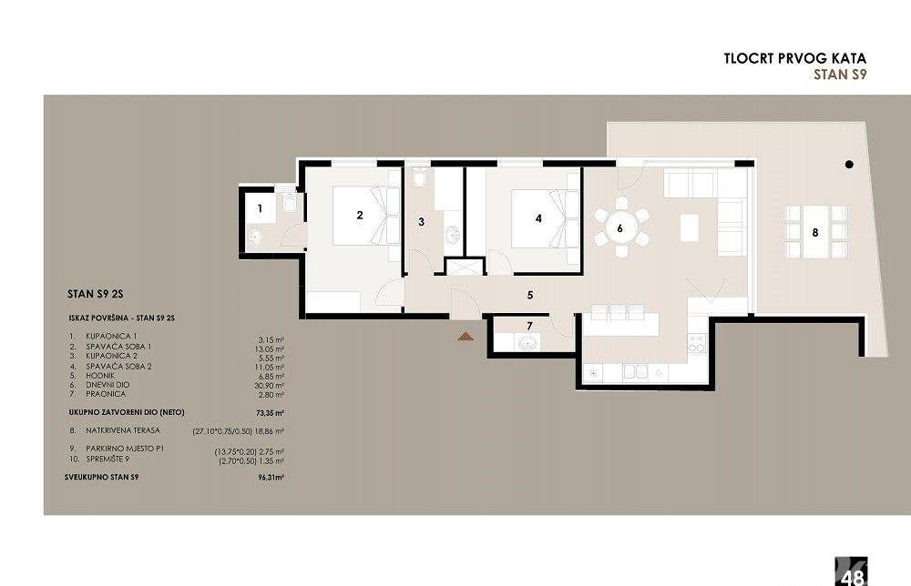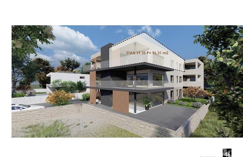 Novi projekt apartmani u izgradnji, predprodaja Smješteni na izvrsnoj lokaciji, udaljeni od mora i plaže svega 100 metara s blagim padom terena prema moru. Apartman S9 smještena je na drugom katu i sastoji se od hodnika,dvije kupaone, dvije spavaće sobe, kuhinje s dnevnim boravkom, cw, natkrivenom terasom, ostava (spremište br,9) 2.70 m2. Apartmanu pripada parkirno mjesto P1 13.75 m2 planirani rok završnih radova početak 2026 godine. Cijena apartmana s pripadcima iznosi 385 000