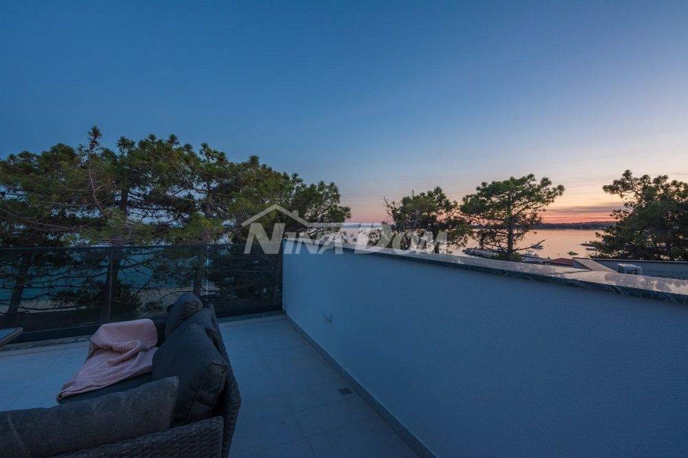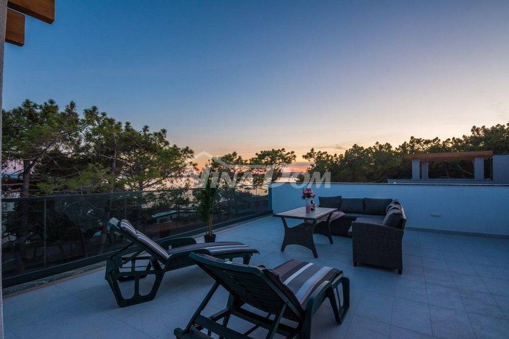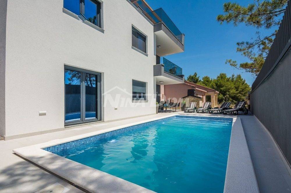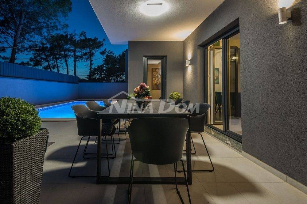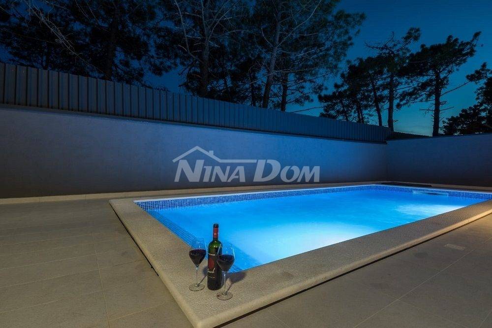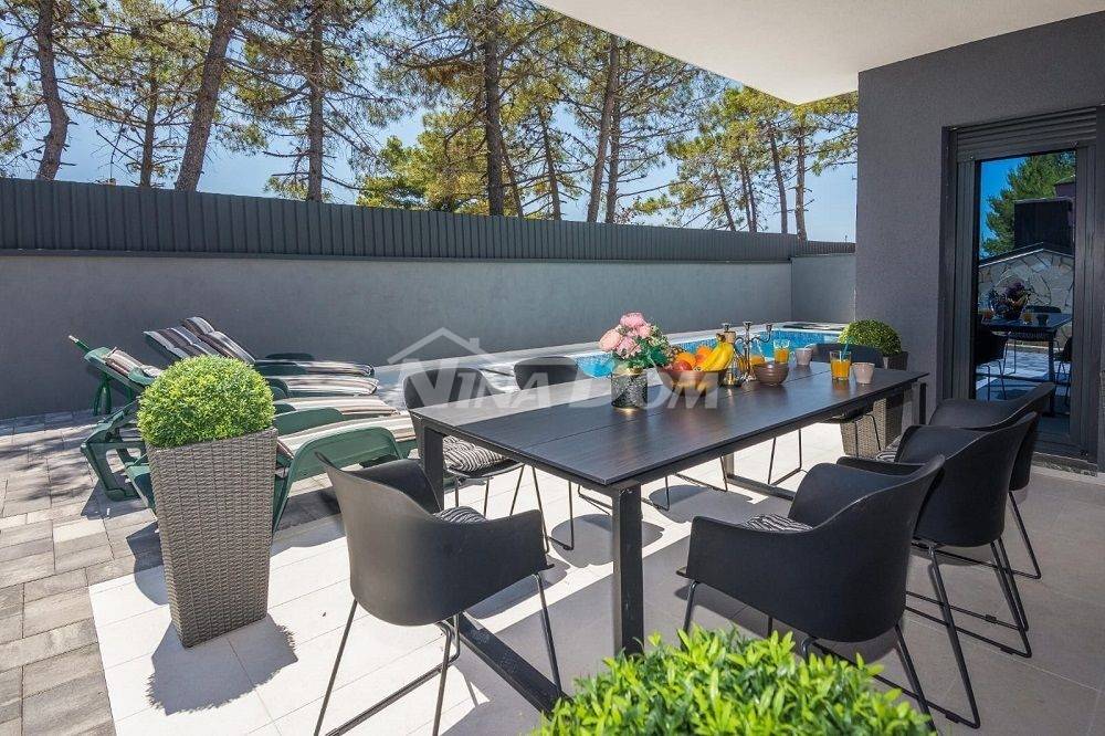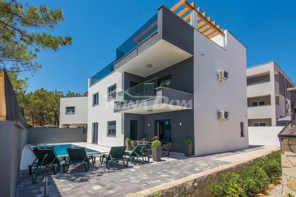 Okućnica uređena s bazenom, parkirna mjesta. Nalazi se u slijepoj ulici što joj dodatno daje dozu intimnosti gostima, prekrasan pogled na more. Od mora i plaže udaljena je 70 metara zrečne linije dok prilaznom cestom im 150 metara.
