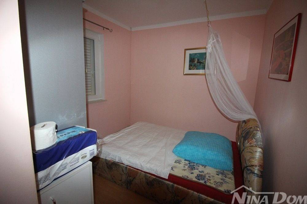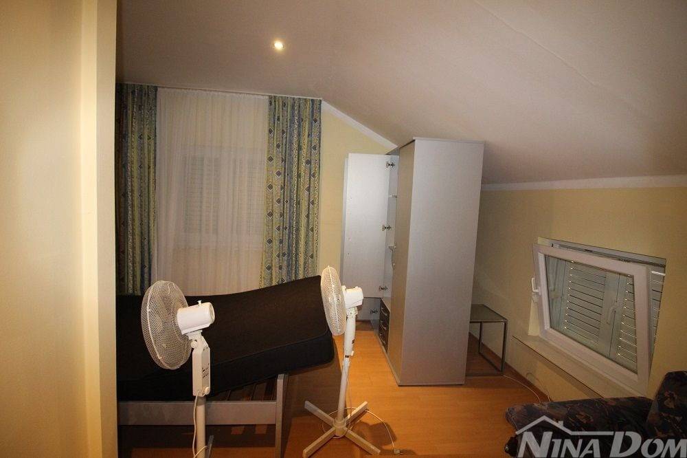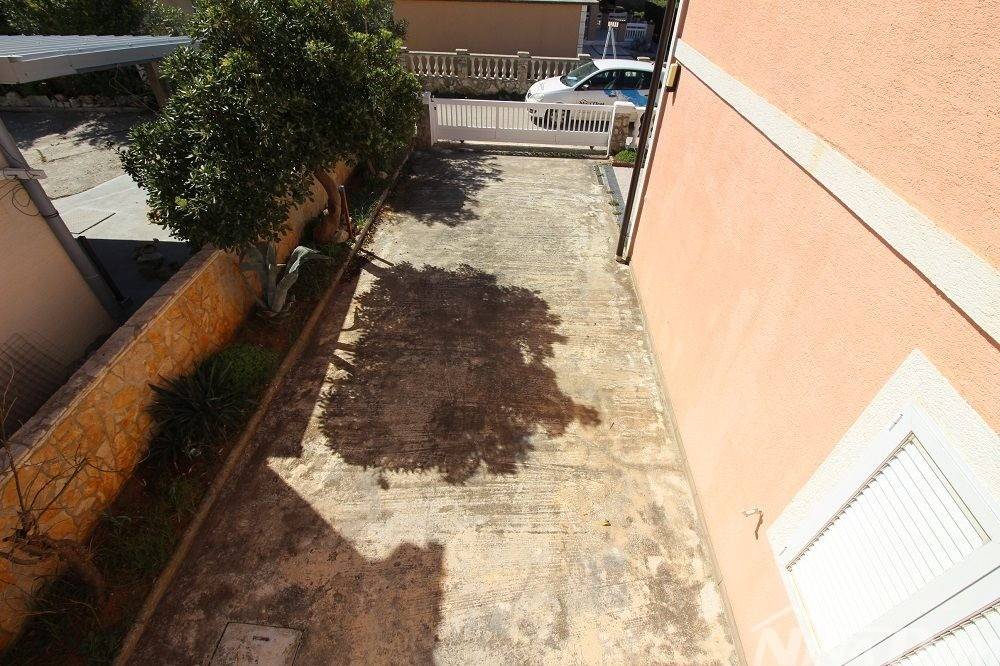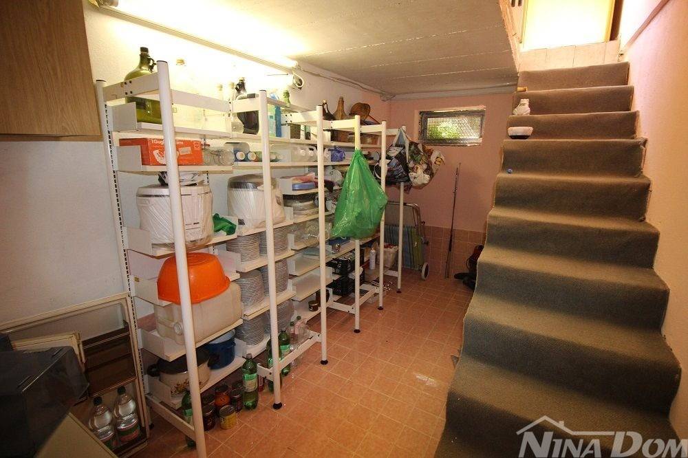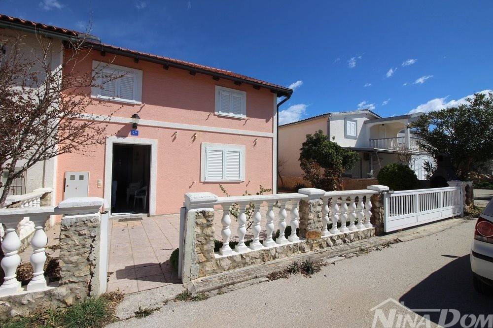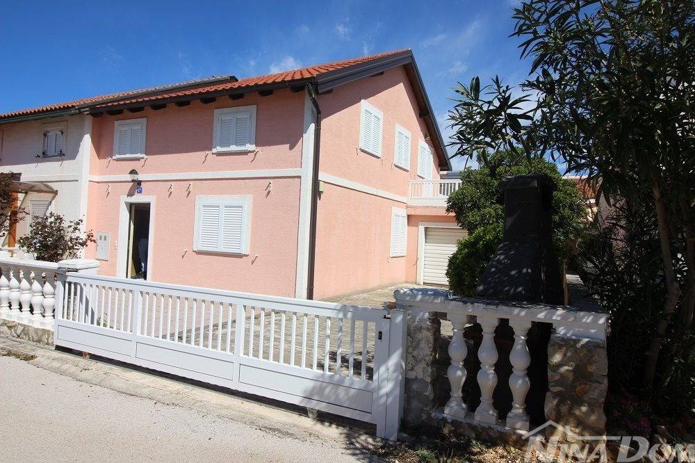 Obiteljska kuća s garažom. (dvojnica) Prizemlje: hodnik, dnevni boravak, kuhinja s blagovaonicom, kupaona, dvije spavaće sobe, podrum i garaža. Unutarnje stepenice, na katu dvije spavaće sobe od kojih svaka ima čajnu kuhinju, kupaonu terasu, i dodatna velika samostalna kupaona. Okućnica uređena popločana laka za održavanje. Od mora i plaže udaljena 500 metara.