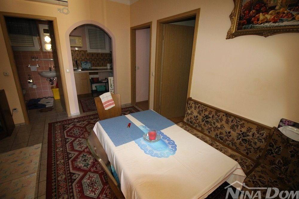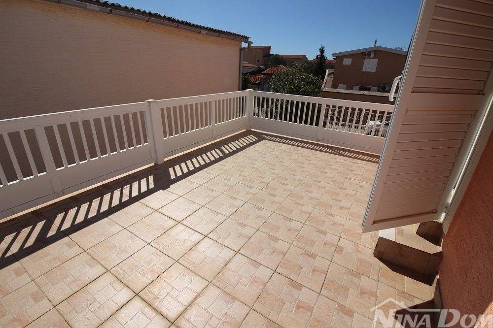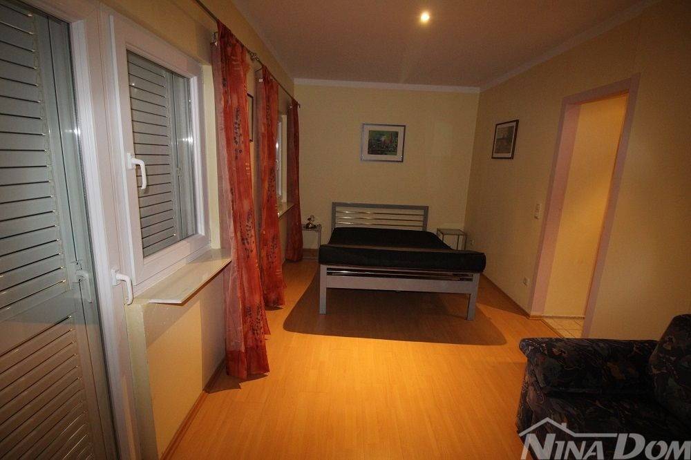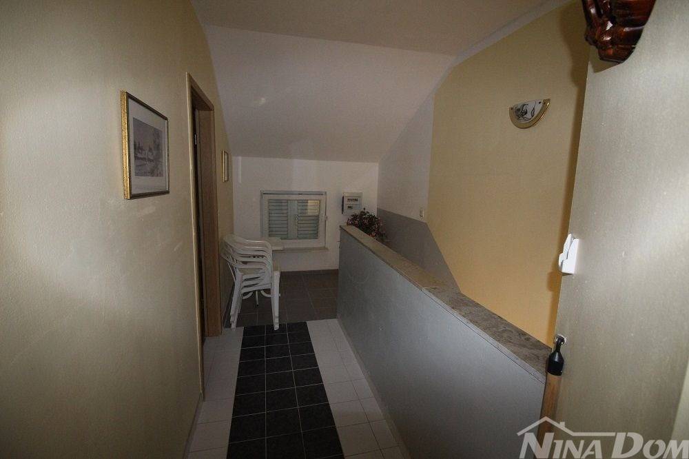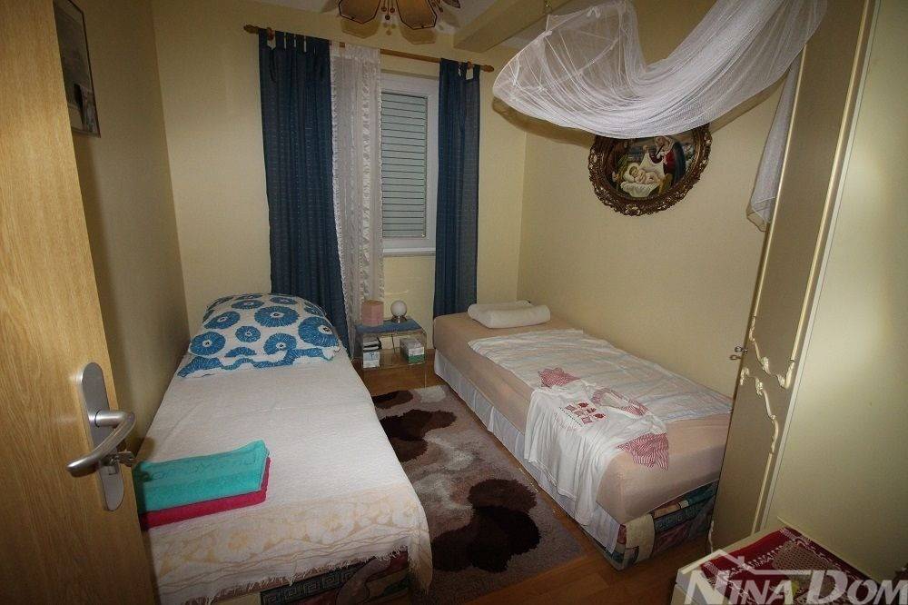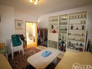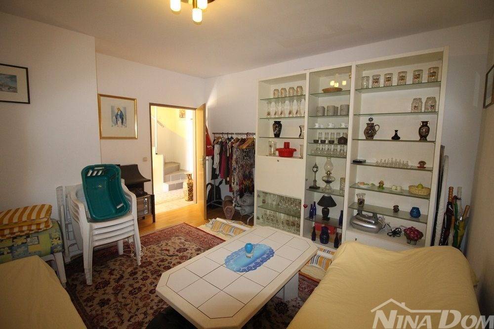 Obiteljska kuća s garažom. (dvojnica) Prizemlje: hodnik, dnevni boravak, kuhinja s blagovaonicom, kupaona, dvije spavaće sobe, podrum i garaža. Unutarnje stepenice, na katu dvije spavaće sobe od kojih svaka ima čajnu kuhinju, kupaonu terasu, i dodatna velika samostalna kupaona. Okućnica uređena popločana laka za održavanje. Od mora i plaže udaljena 500 metara.