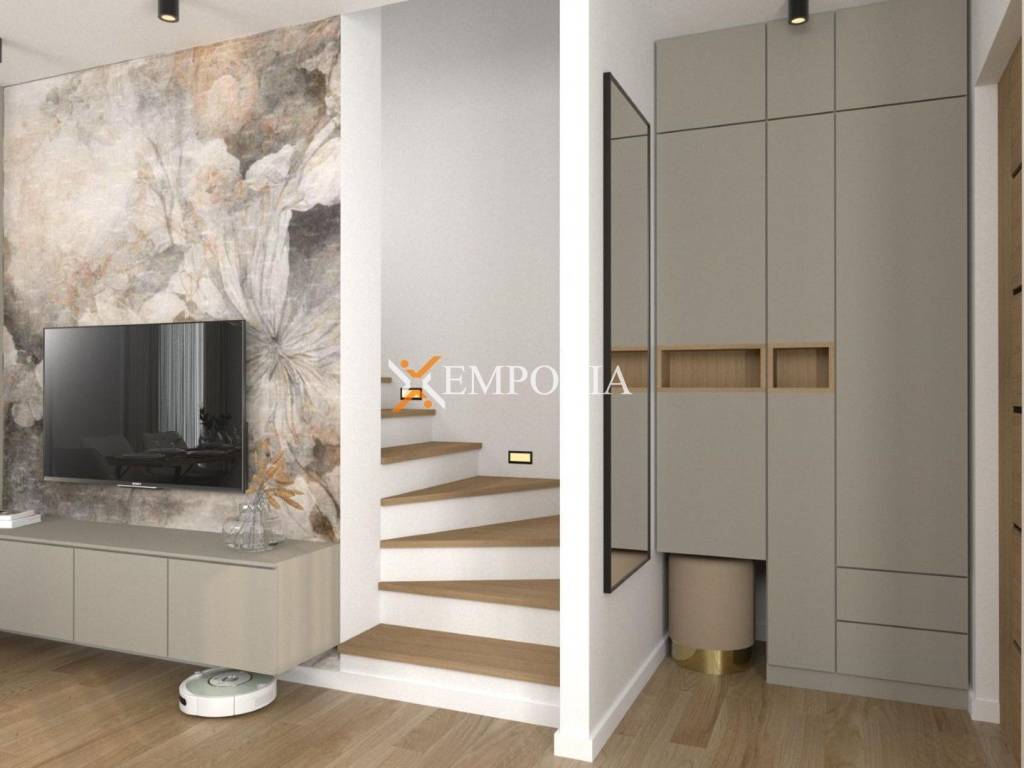 Semi-detached house with a swimming pool in Poličnik is for sale. It is a modern new building.The house consists of a ground floor and a first floor. Layout of the rooms on the ground floor consists of an entrance, a storage room, a toilet, a kitchen with a dining room and a living room, and two covered terraces. Internal stairs lead to the first floor, where there is a hallway, bathroom, two bedrooms, a bedroom with a wardrobe and a loggia. The area of ​​the above mentioned is 95,24 m2.In addition, the house has a swimming pool of 15 m2, a garden and one outdoor parking space.Total area of ​​the house with all additional parts is 104,99 m2.Distance of this property from the sea is 9 km. Distance from the center of Poličnik is 750 m.