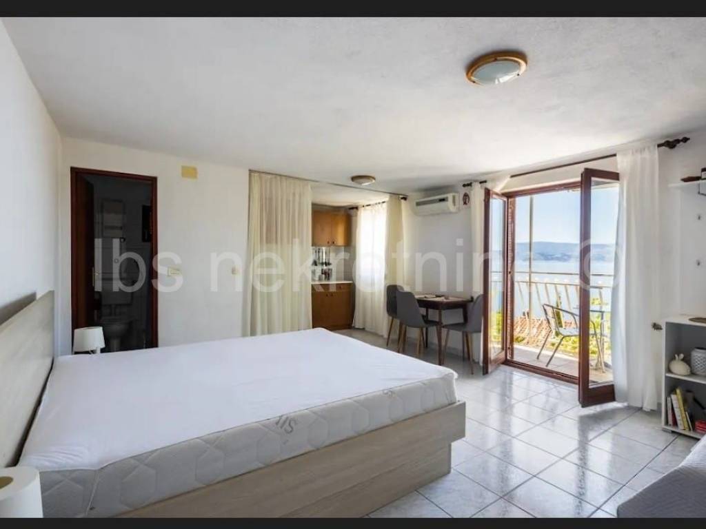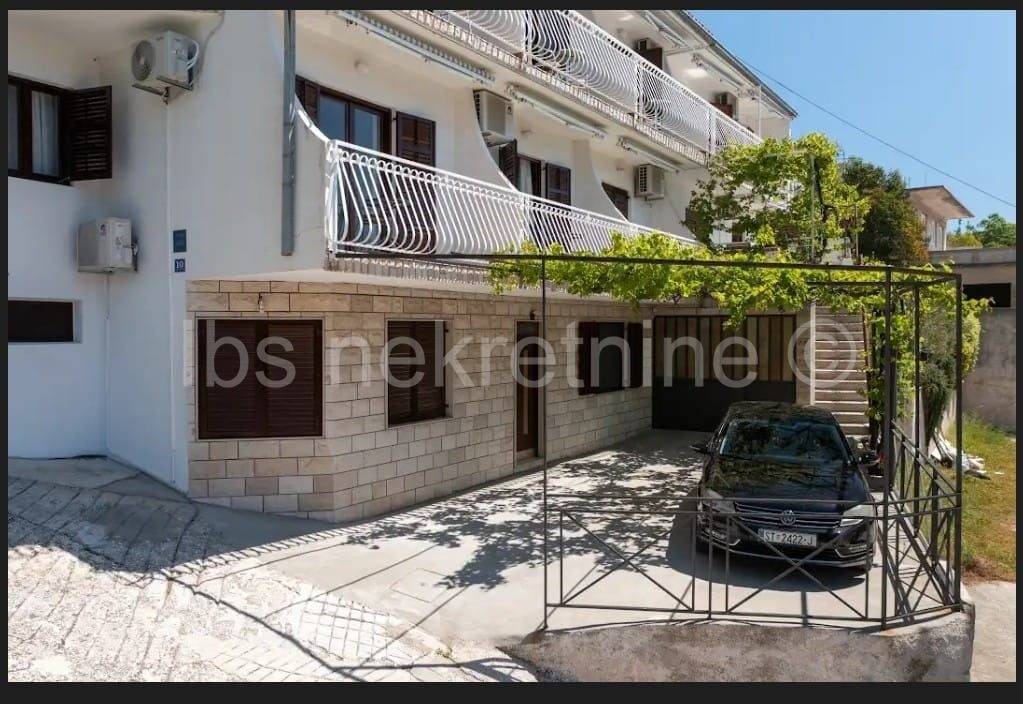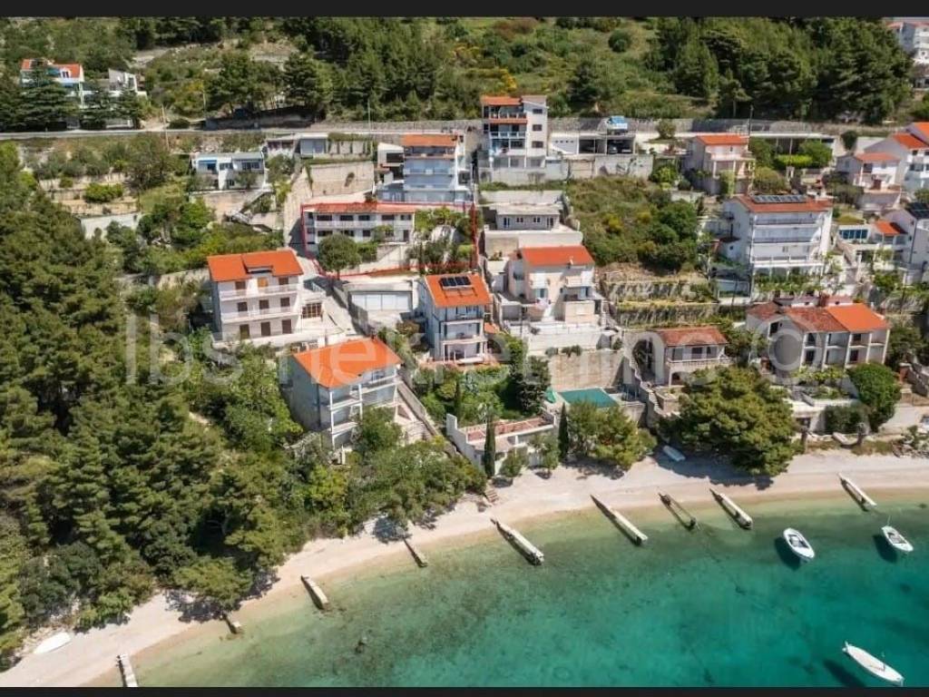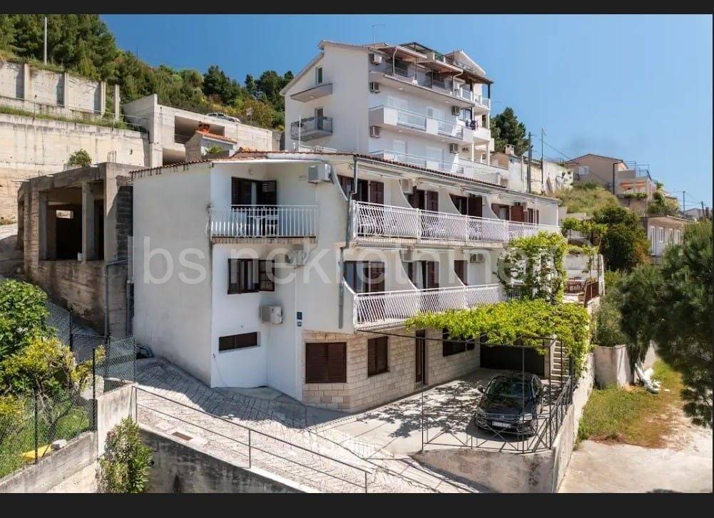 Ekskluzivna Prodaja agencije IBS nekretnine!! Stanići, Apartmanska kuća s otvorenim pogledom na more i otok Brač smještena u trećem redu od mora u malom turističkom mjestu na 5km udaljenosti od Omiša. Nekretnina stambene površine 450m2 je položena na zemljištu od 315m2 te se prostire na tri etaže. U prizemlju se nalazi apartman koji se sastoji od dvije spavaće sobe, dvije kupaonice, kuhinje s blagovaonicom i dnevnog boravka. Na ovoj etaži se nalazi i garaža sa tri parkirna mjesta te dvorište sa dva vanjska parkirna mjesta. Na prvom katu i drugom katu se nalaze po tri studio apartmana i jedan jednosobni apartman. Sve jedinice imaju vlastitu kuhinju, kupaonicu i balkon sa kojeg se pruža neometani otvoreni pogled na more. U dvorištu prvog kata se nalazi predio za roštilj i otvoreni prostor za sunčanje. Nalazi se na 50 m udaljenosti od velike uređene šljunčane plaže i u blizini svih potrebnih sadržaja za življenje. Lokacija nekretnine je na svega nekoliko km udaljenosti od Omiša te 30 minuti vožnje od centra grada Makarske i Splita.