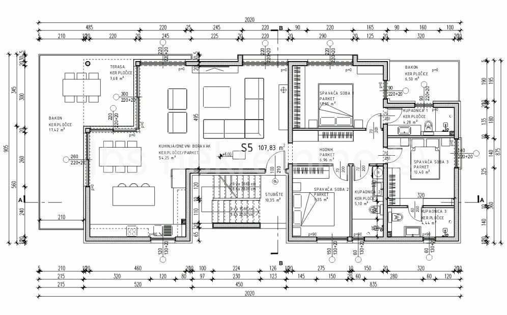 S5- 107.83 m2 + terrace 17.42 m2 + terrace 6.50 + roof.