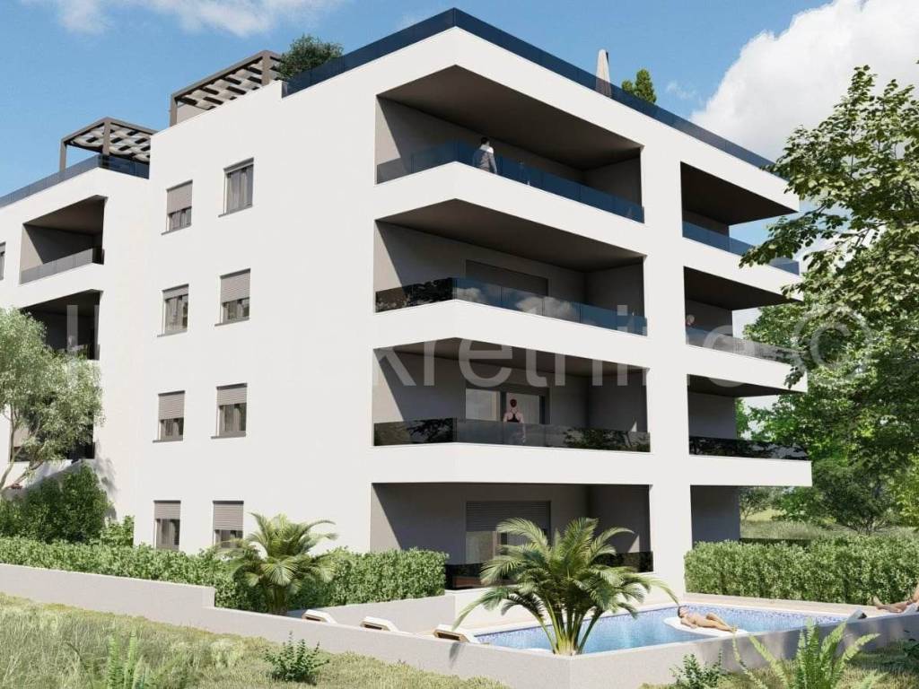 We are selling a comfortable two-bedroom apartment with a roof terrace in an excellent location only 4 km from the UNESCO city of Trogir in the southern part of Okrug Gornji. The apartment located on the third floor consists of two bedrooms, a bathroom, a storage room, a living room, a kitchen with a dining room, a balcony of 84.20 m2 and a roof terrace of 88.90 m2. The price of the apartment includes a garage space.