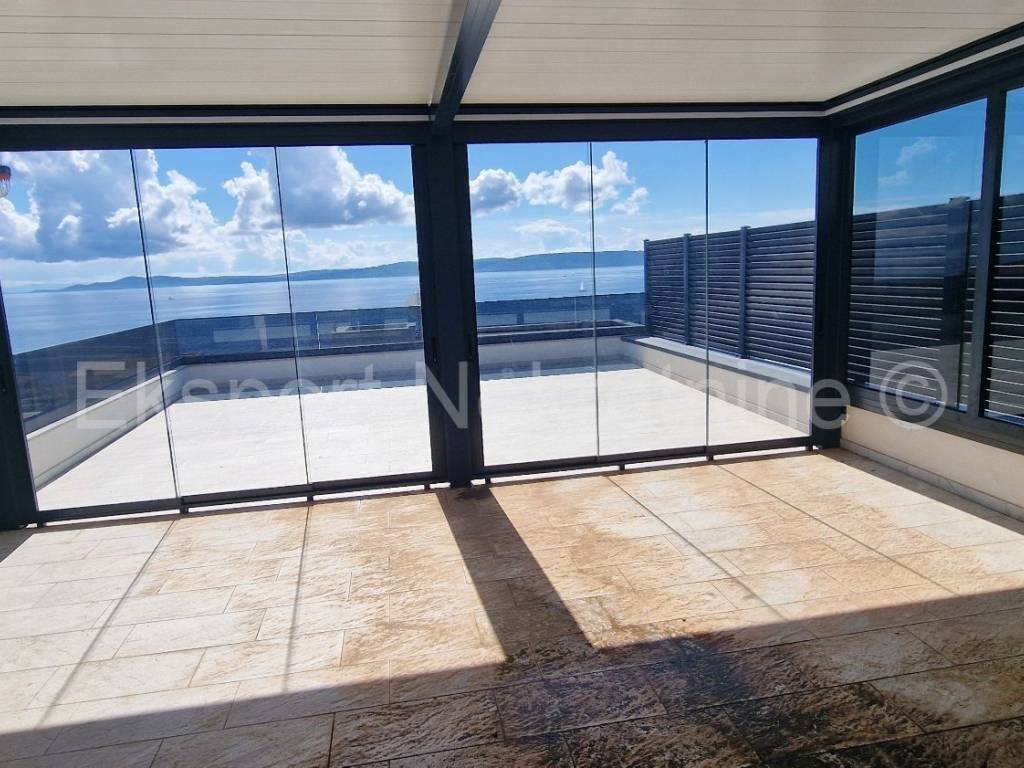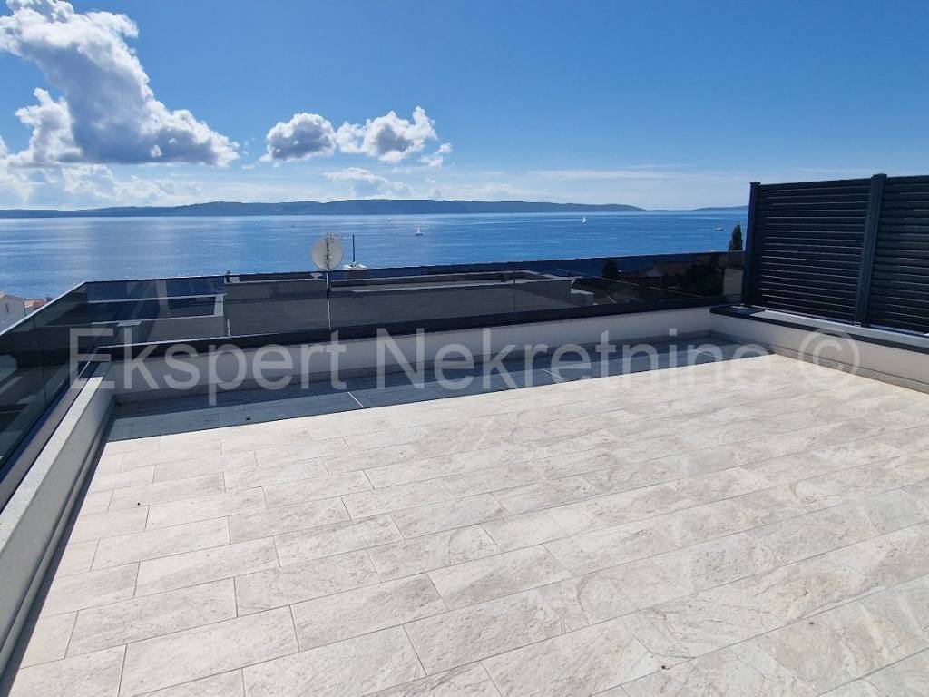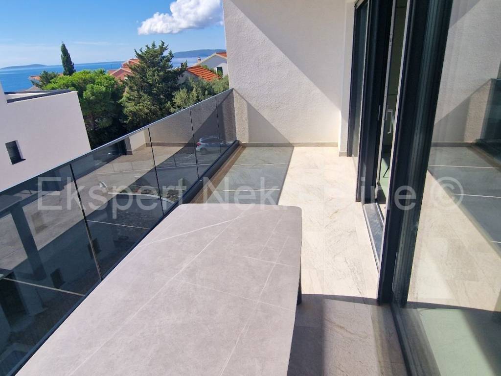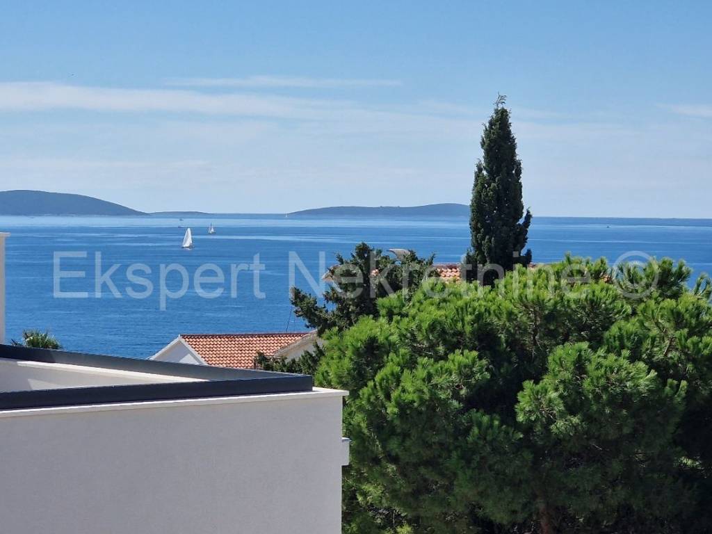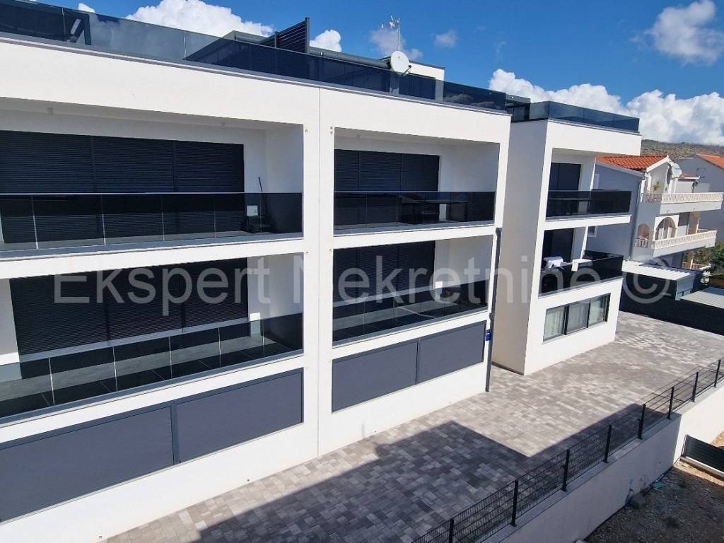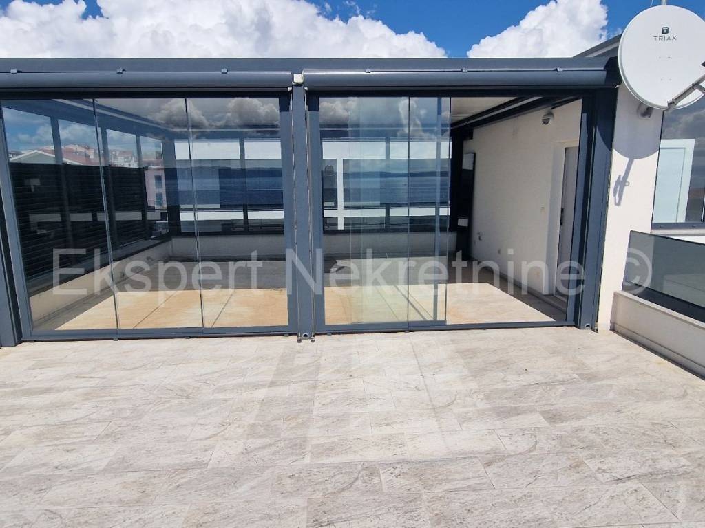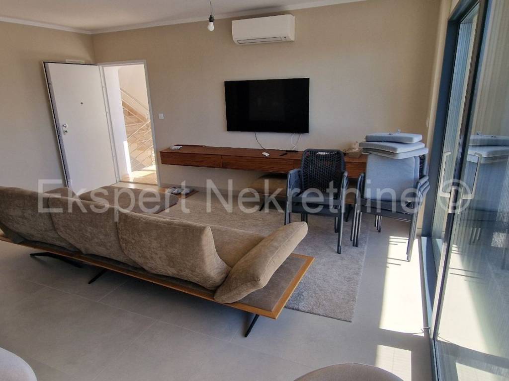 Čiovo, Okrug Gornji, penthouse 66 m2 + 67 m2 roof terrace with bioclimatic awning in a new building with an open sea view only 150 m away from the sea and the beach. The apartment is located on the 2nd floor (last) and is north-south oriented and has two bedrooms, bathroom, kitchen with dining room and living room, and a large terrace (13 m2) to the south with a partial sea view and a large roof terrace (69m2) with a bioclimatic awning with glazed side walls, and the possibility of setting up a barbecue as well as a summer kitchen and a jacuzzi. The apartment is located in a newly built building (2022) and is fully furnished with quality and modern furniture and appliances. Quality construction and equipment of the apartment (quality ceramics, underfloor heating throughout the apartment, electric shutters, air conditioning units in each room, large glass wall in the living room, large terrace, glass fence, bioclimatic awning, glazed part of the roof terrace, etc.). The apartment also has one outdoor parking space. Excellent and quiet location on the south side of the island of Čiovo, close to the sea and beach and panoramic sea views from the terrace. The apartment is ready to move in immediately. Ownership is in order.For more info, contact the agency.