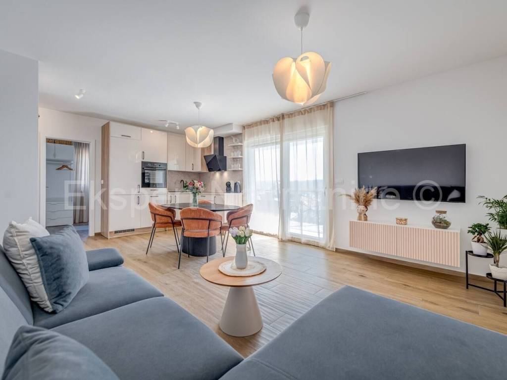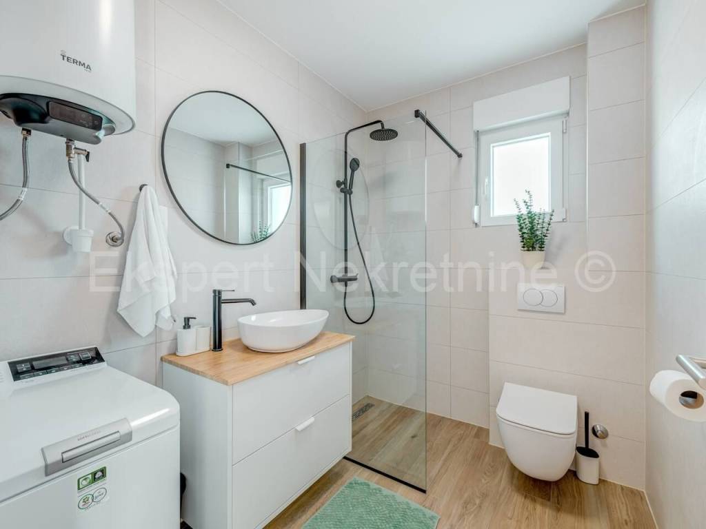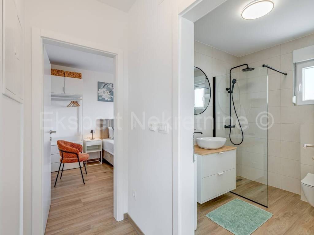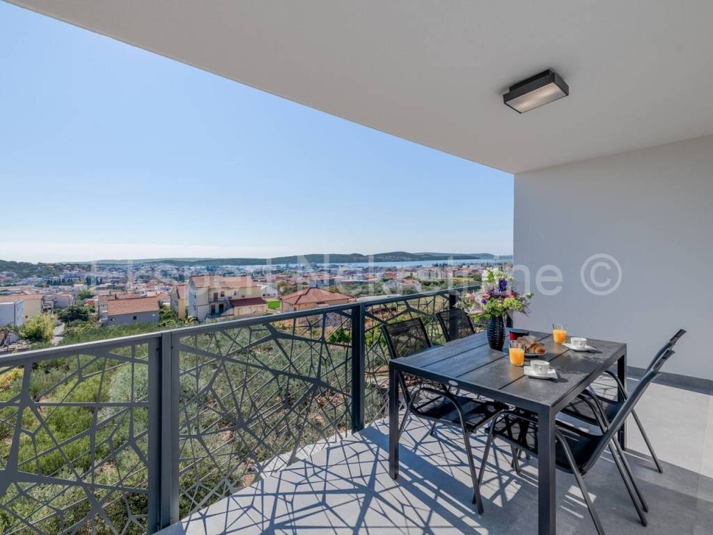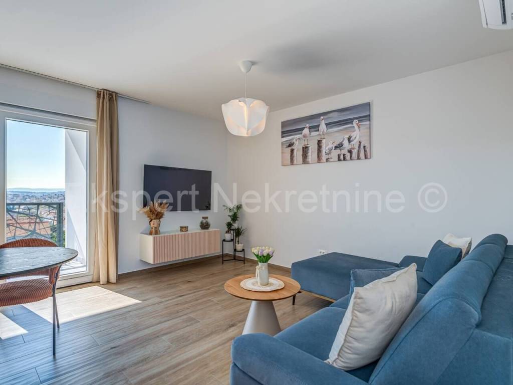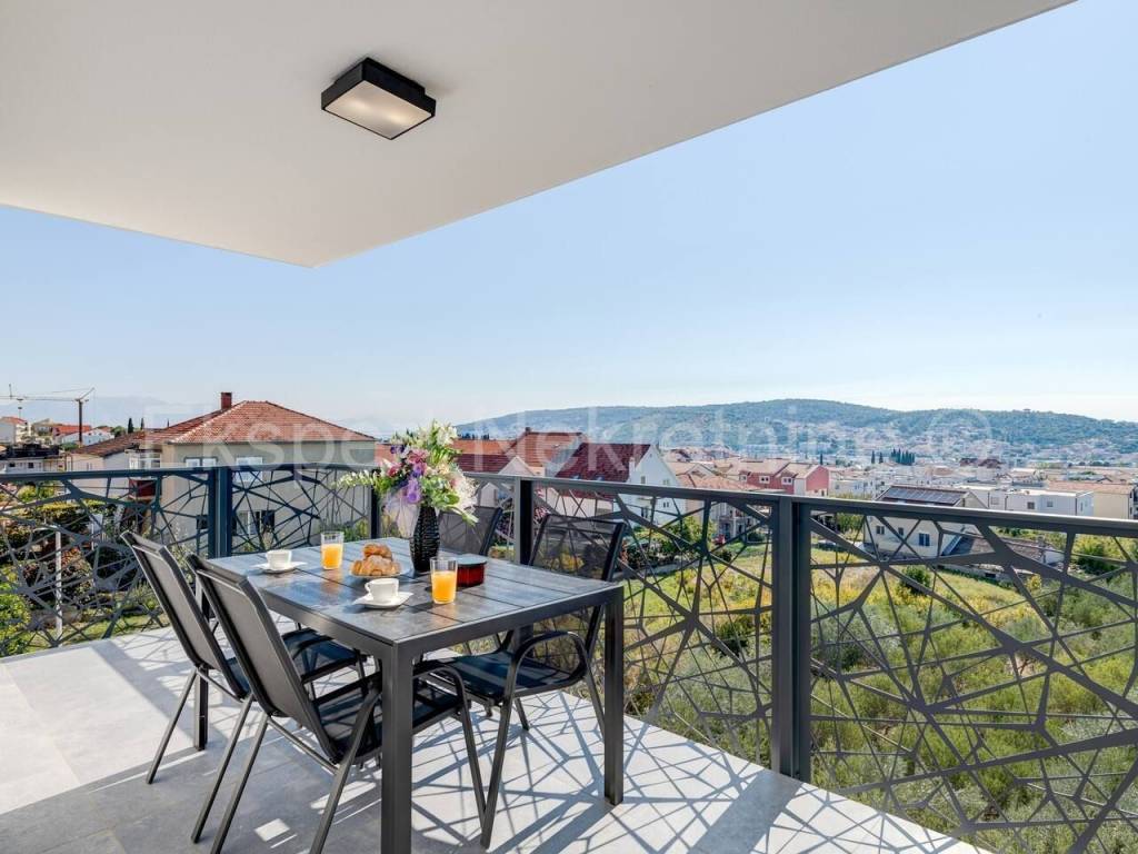Trogir, two-bedroom apartment 65 m2 in a new building in a smaller residential building with only 6 apartments. The apartment is brand new and fully furnished with new and modern furniture.The apartment is located on the second (last) floor of the building, north-south-east oriented and consists of 2 bedrooms, bathroom, hallway, kitchen with dining room and large living room, and a large balcony (10m2) from which there is a beautiful and open view of the sea and the city..The apartment has 1 parking space. The building is located in a great location near the city center. The apartment is brand new. It is fully furnished and equipped with quality furniture. Quality equipment (inverter air conditioning, underfloor heating, PVC joinery, quality ceramics, security doors ... etc.). Ready to move in immediately. Ownership is neat. Possibility of purchasing on credit.For more information, contact the agency ..