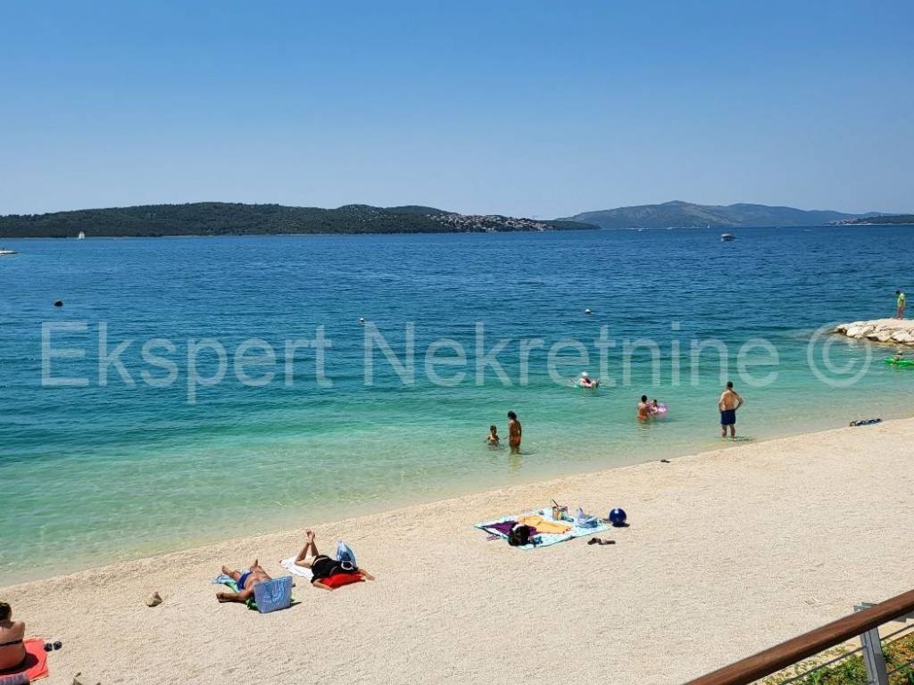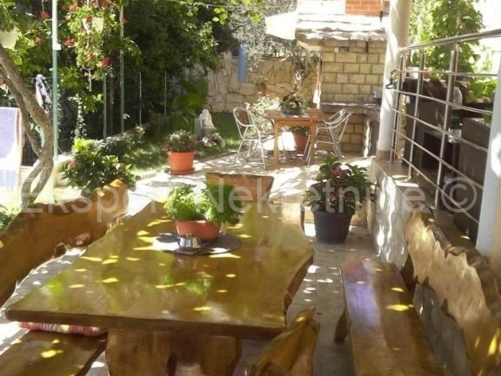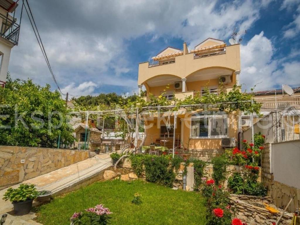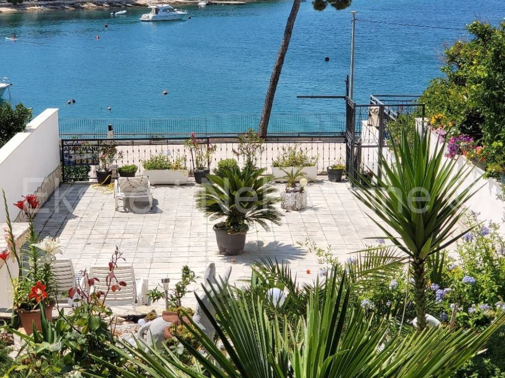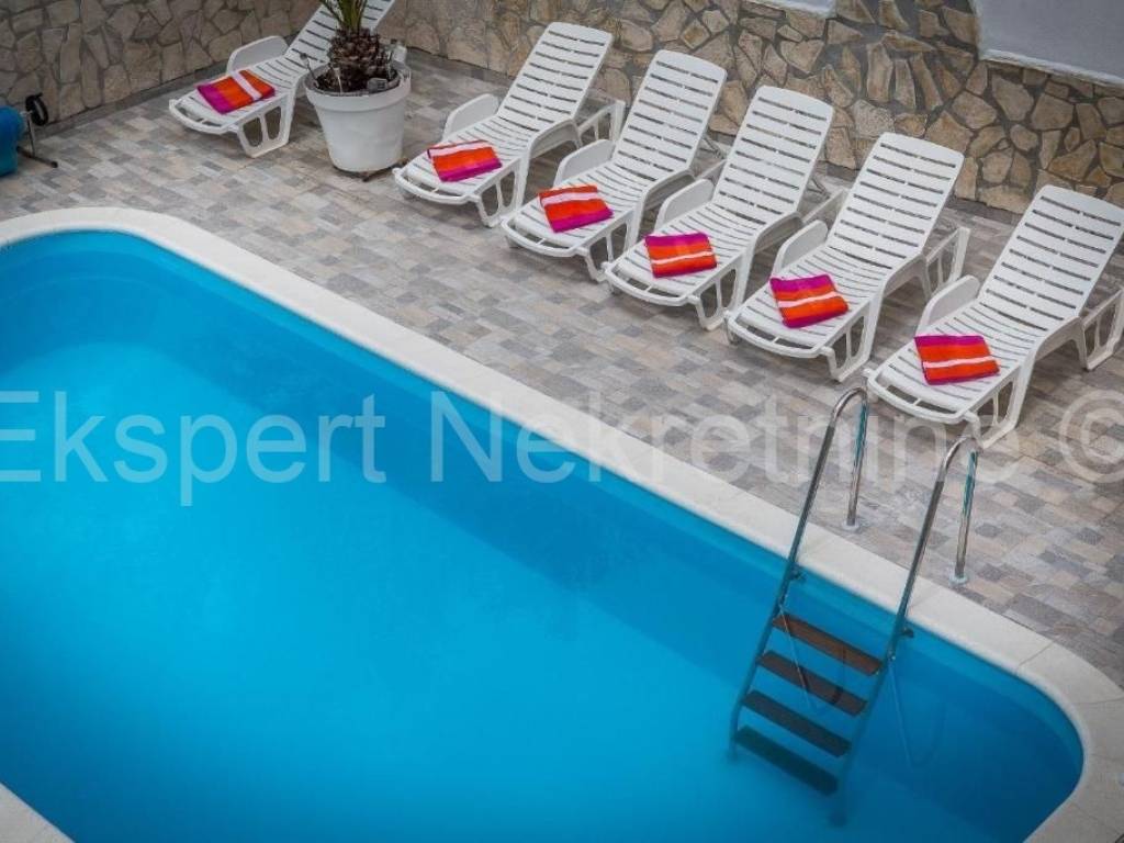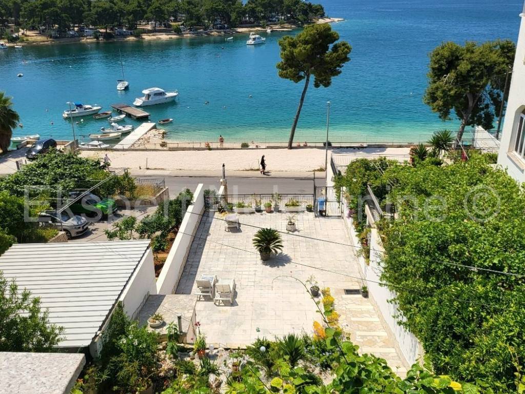 Trogir, Saldun, semi-detached house 471 m2 with 6 apartments and a swimming pool and a large and well-kept yard and a large garage 109 m2 (business space), on three floors, first row to the sea. The house is located on a plot of 783 m2, and the ground floor is comfortable two-room apartment with two large bedrooms, kitchen, dining room and living room, hallway, staircase and storage room. On the first floor there are three one-room apartments, each with a loggia with a beautiful and open view of the sea. On the second floor there are two one-room apartments with terraces that offer a beautiful and unobstructed view of the sea. The house also has a large garage that is registered as a business premises, and a large landscaped garden planted with Mediterranean fruit trees and plants and a swimming pool. The house has several parking spaces. Excellent and unique location, very close to the sea and the newly renovated beach (25 m) and only 800 m2 from the old town of Trogir. Ideal for tourist rental. Neat ownership. For more info or visits, contact the agency.