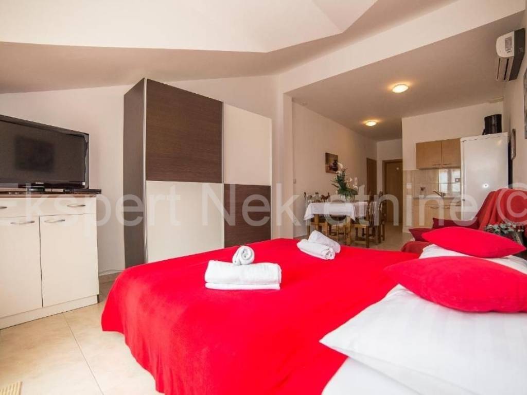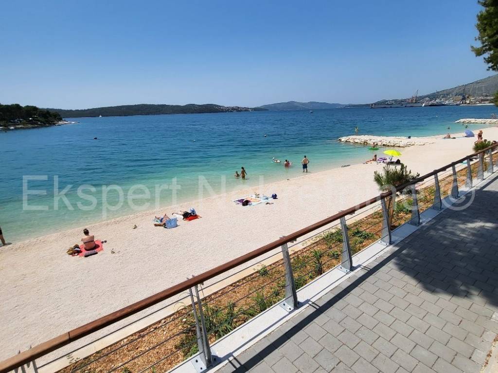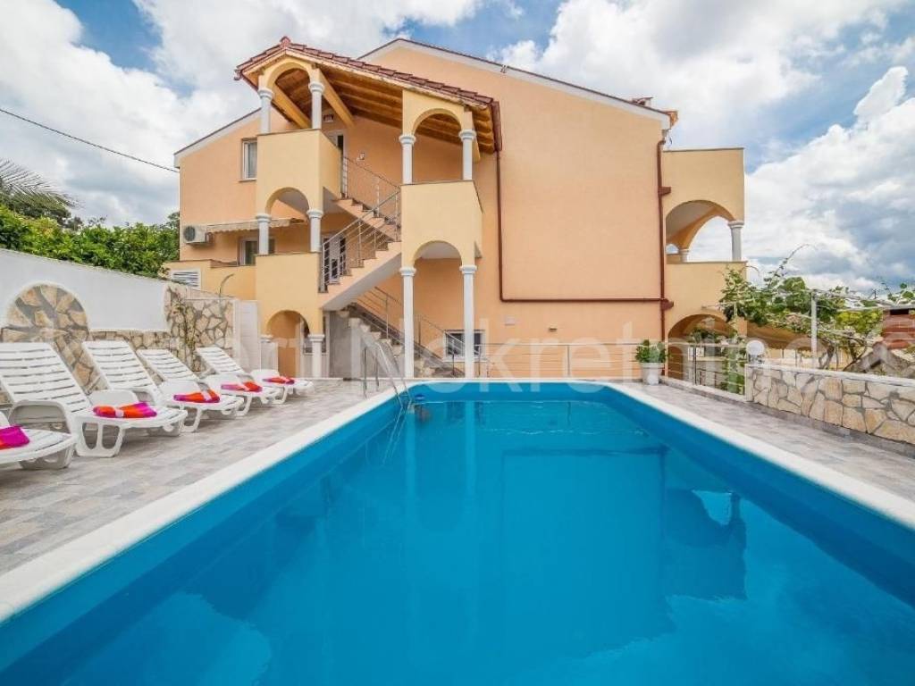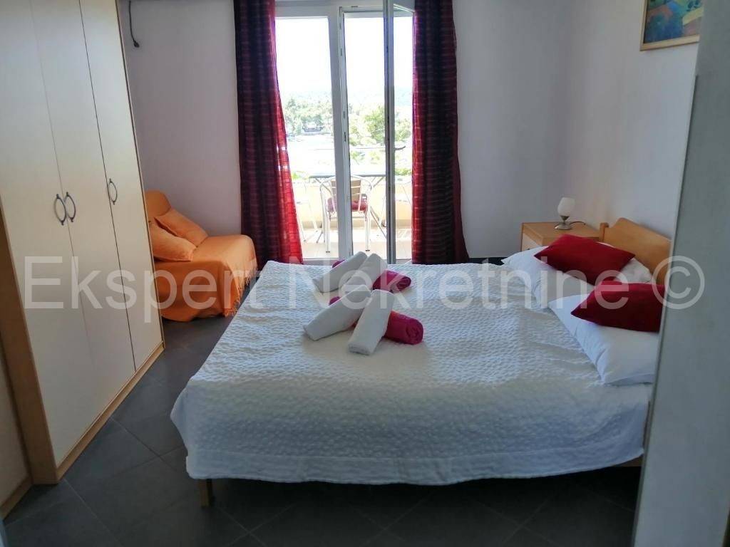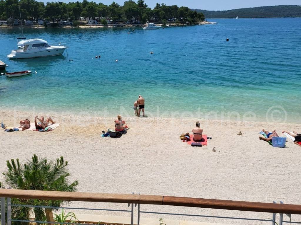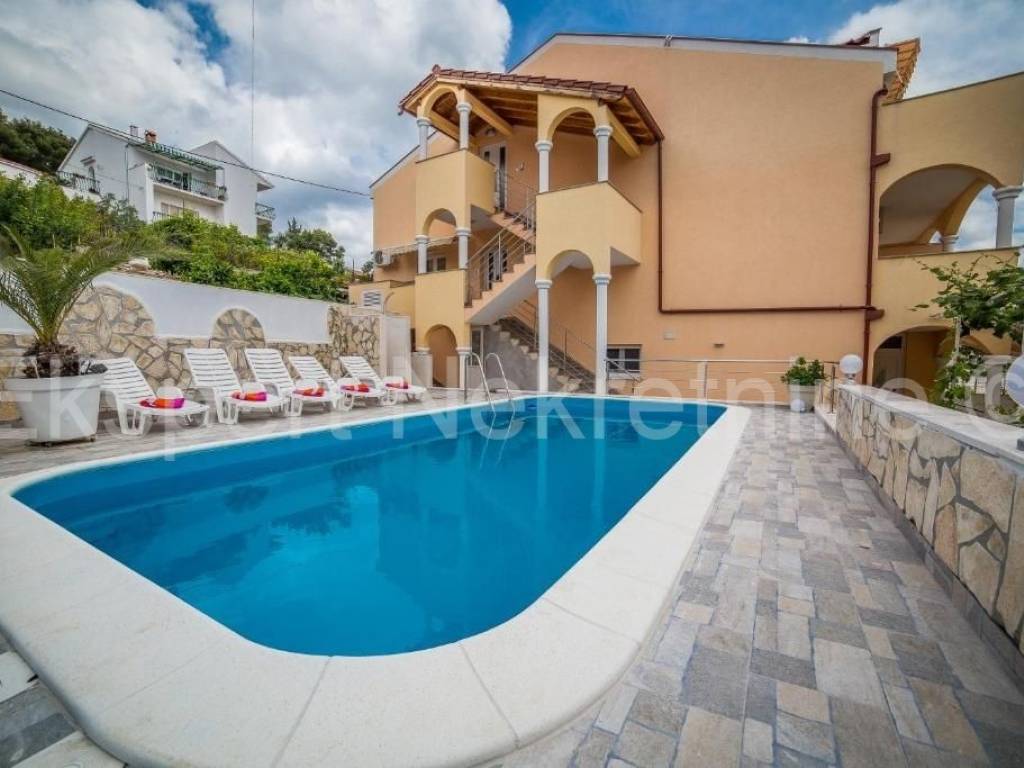 Trogir, Saldun, semi-detached house 471 m2 with 6 apartments and a swimming pool and a large and well-kept yard and a large garage 109 m2 (business space), on three floors, first row to the sea. The house is located on a plot of 783 m2, and the ground floor is comfortable two-room apartment with two large bedrooms, kitchen, dining room and living room, hallway, staircase and storage room. On the first floor there are three one-room apartments, each with a loggia with a beautiful and open view of the sea. On the second floor there are two one-room apartments with terraces that offer a beautiful and unobstructed view of the sea. The house also has a large garage that is registered as a business premises, and a large landscaped garden planted with Mediterranean fruit trees and plants and a swimming pool. The house has several parking spaces. Excellent and unique location, very close to the sea and the newly renovated beach (25 m) and only 800 m2 from the old town of Trogir. Ideal for tourist rental. Neat ownership. For more info or visits, contact the agency.