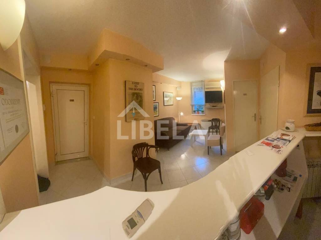 koji je trenutno stomatološka ordinacija, a može se uz malo truda vratiti u funkciju stambenog prostora. Stan je pun svjetla, a sastoji se od ulaznog prostora, predsoblja - koje se može adaptirati u kuhinju, tri sobe (moguća adaptacija po želji), kupaone s toaletom plus još jedan toalet. Grijanje i topla voda je na plin - etažno. Tv i brzi internet putem optičkog kabla.