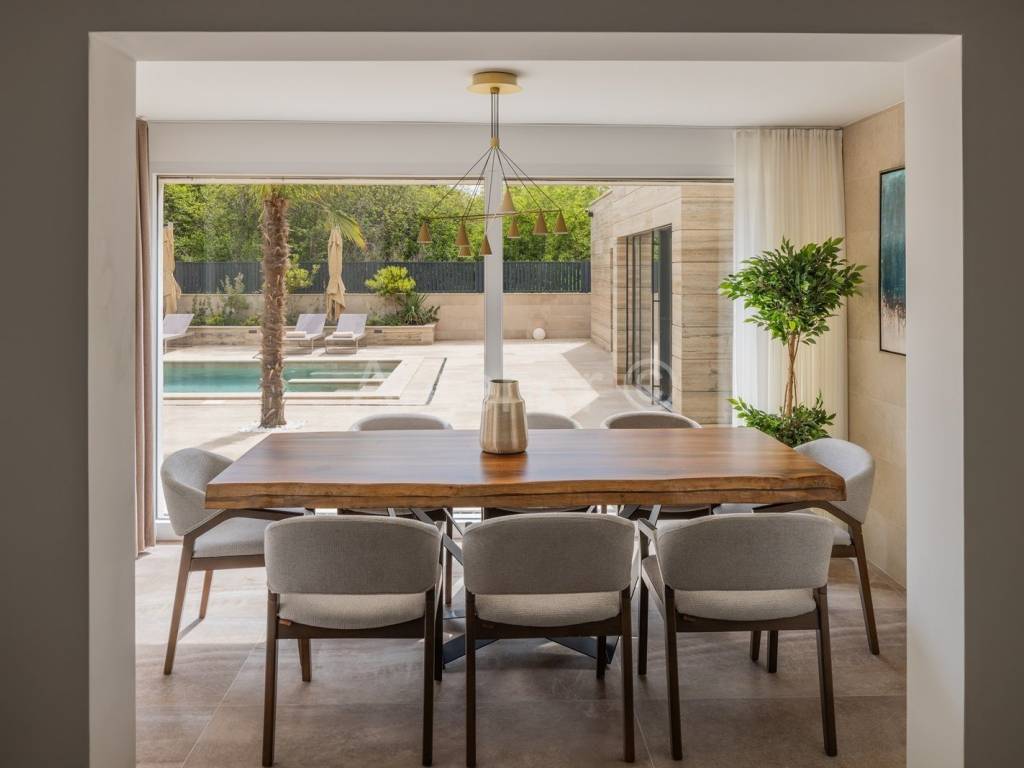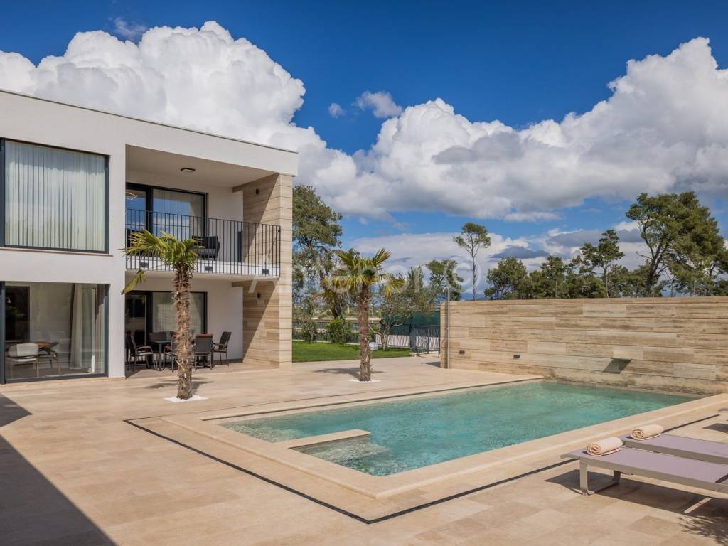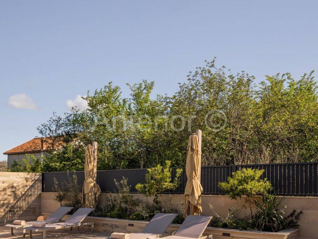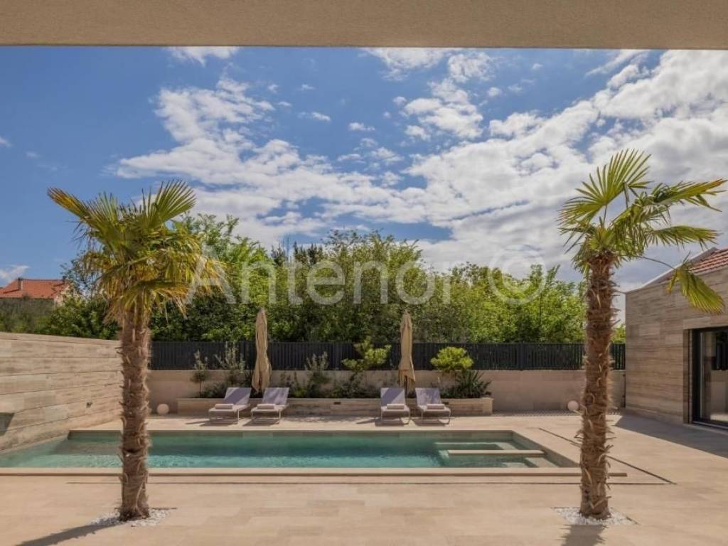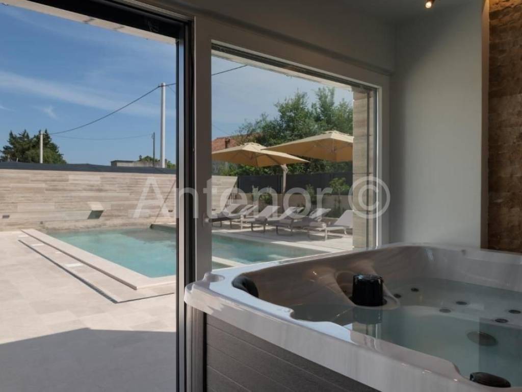 Vanjski dio ove kuće čini uređena terasa, dvorište, bazen, ljetna kuhinja i prostor s dječijim igralištem.