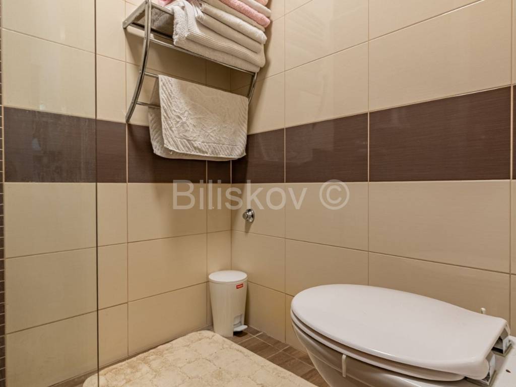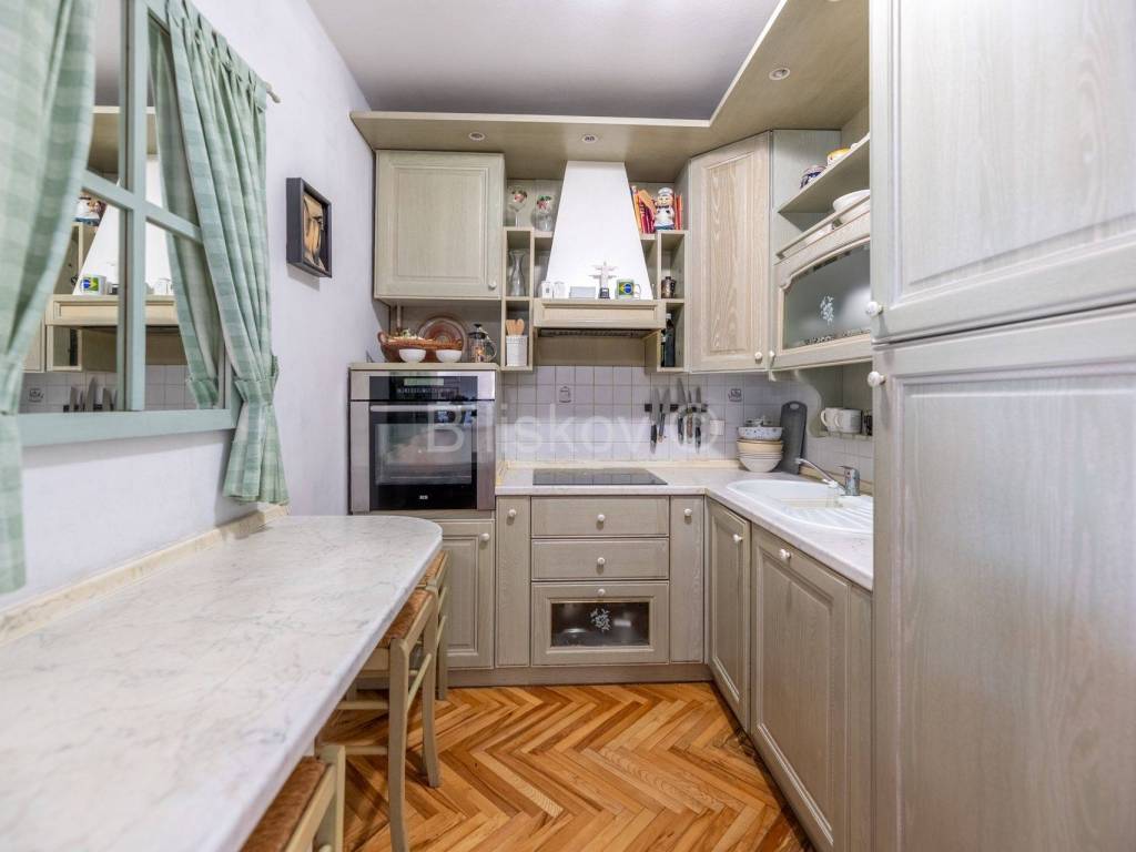 The apartment is sold as seen, including furniture and appliances, all of high quality. It is bright and sunny throughout. The building is constructed with a reinforced concrete frame and brick infill walls, and the roof is concrete with shingles; seven years ago it was reinforced and covered with metal sheets.