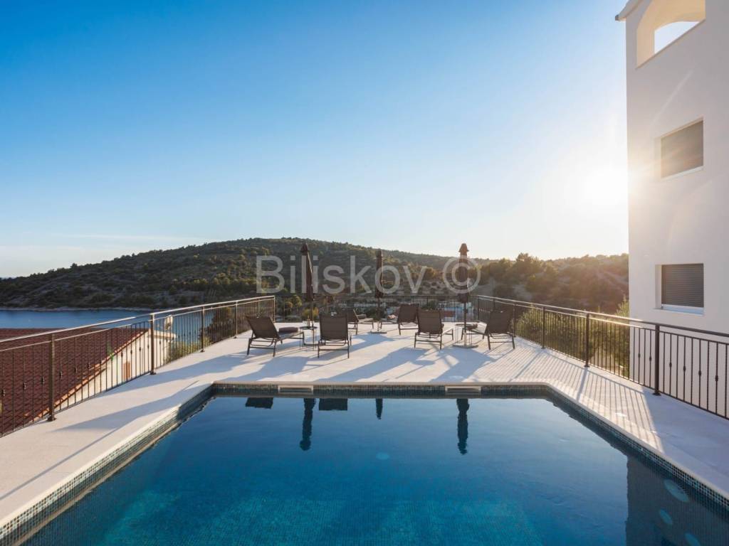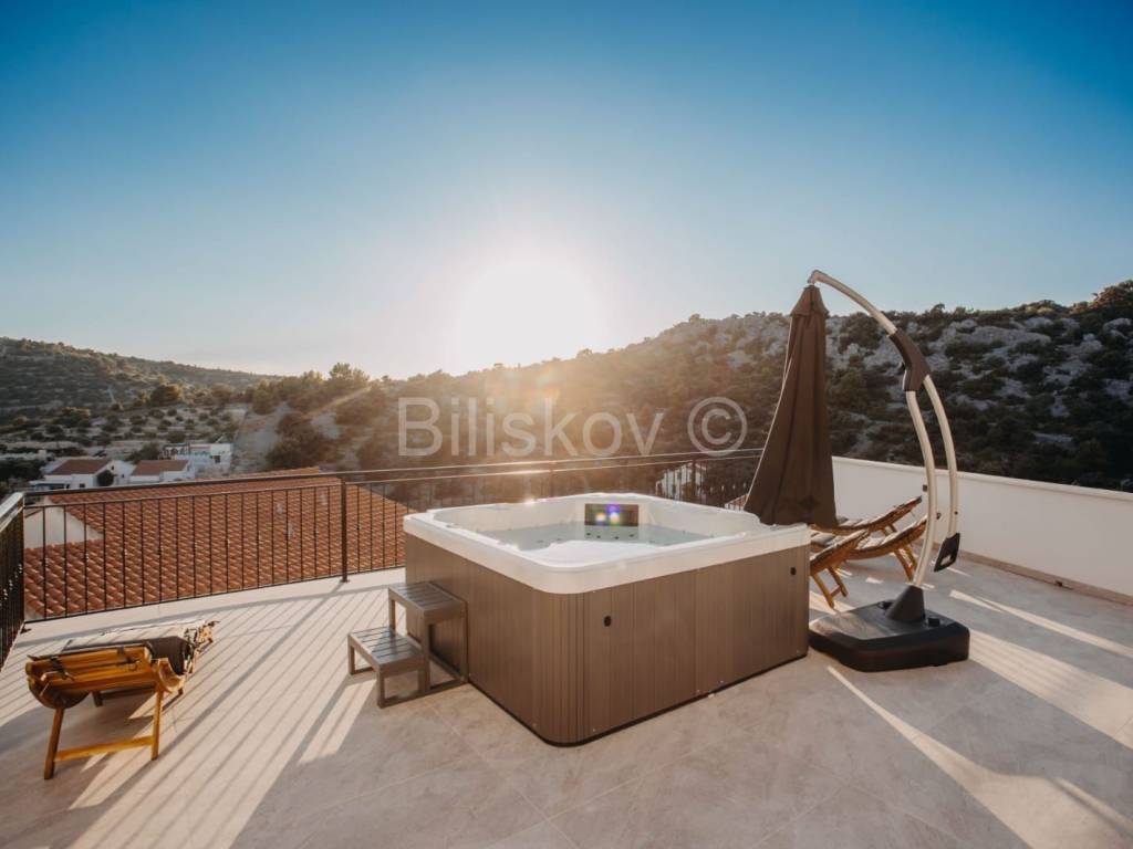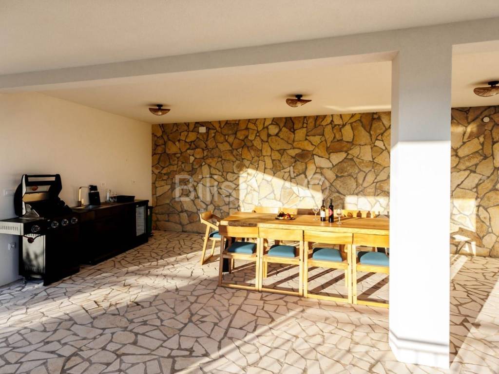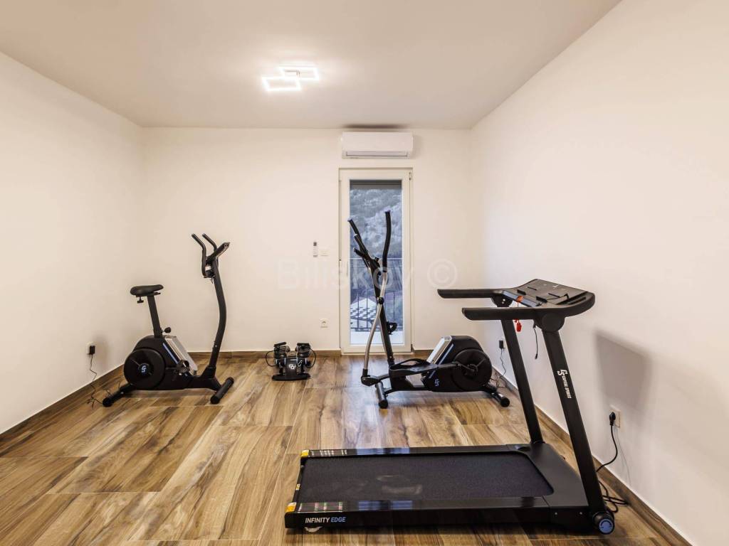 U prizemlju se nalazi dvosobni apartman i podrum, dok se na prvom katu nalaze tri sobe, vešeraj i igraonica. Drugi kat nudi prostor predviđen za saunu, dvije sobe i teretanu, a na trećem katu smješteni su dnevni boravak i kuhinja s izlazom na prostranu terasu. Sve prostorije u kući imaju izlaz na balkon s prekrasnim pogledom na more.