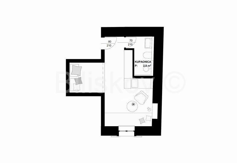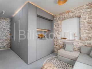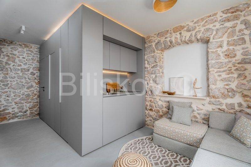 On the south side of the idyllic island of Brač, there is a harmoniously renovated stone house with 9 apartments on three floors.On the first floor there is an apartment of 18.6 m2It consists of a kitchen with a living and sleeping area and a bathroomThe apartment of 18.6 m2 is characterized by: