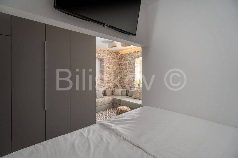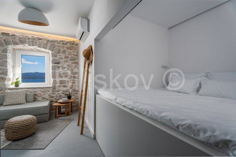 The apartment, along with the entire house, was completely renovated in 2023 and is a successful and well-established tourist rental. All apartment units are modernly decorated, integrated into the indigenous architecture and can be used throughout the year. The interior features smart design and top-notch finishing.From each floor there is a beautiful panoramic view of the island of Hvar.The configuration of the terrain ensures that such a view will remain unobstructed in the future.250 meters from the house there is a local beach, one of the most beautiful on the Adriatic.Public parking about 30 meters from the house.Energy certificate C.Ownership in order.