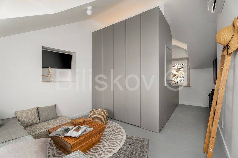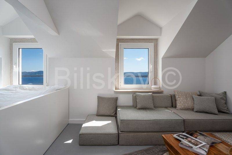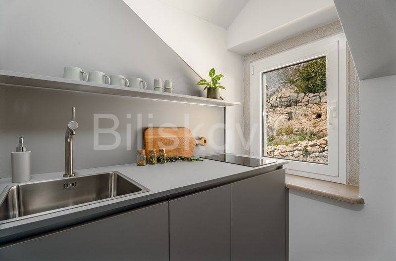 The apartment, along with the entire house, was completely renovated in 2023 and is a successful and well-established tourist rental. All apartment units are modernly decorated, integrated into the indigenous architecture and can be used throughout the year. The interior features smart design and top-notch finishing.From each floor there is a beautiful panoramic view of the island of Hvar.The configuration of the terrain ensures that such a view will remain unobstructed in the future.250 meters from the house there is a local beach, one of the most beautiful on the Adriatic.Public parking about 30 meters from the house.Energy certificate C.Ownership in order.