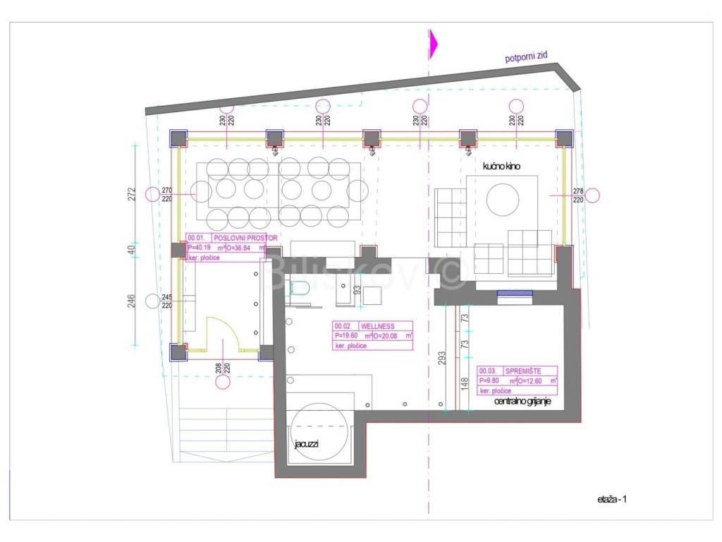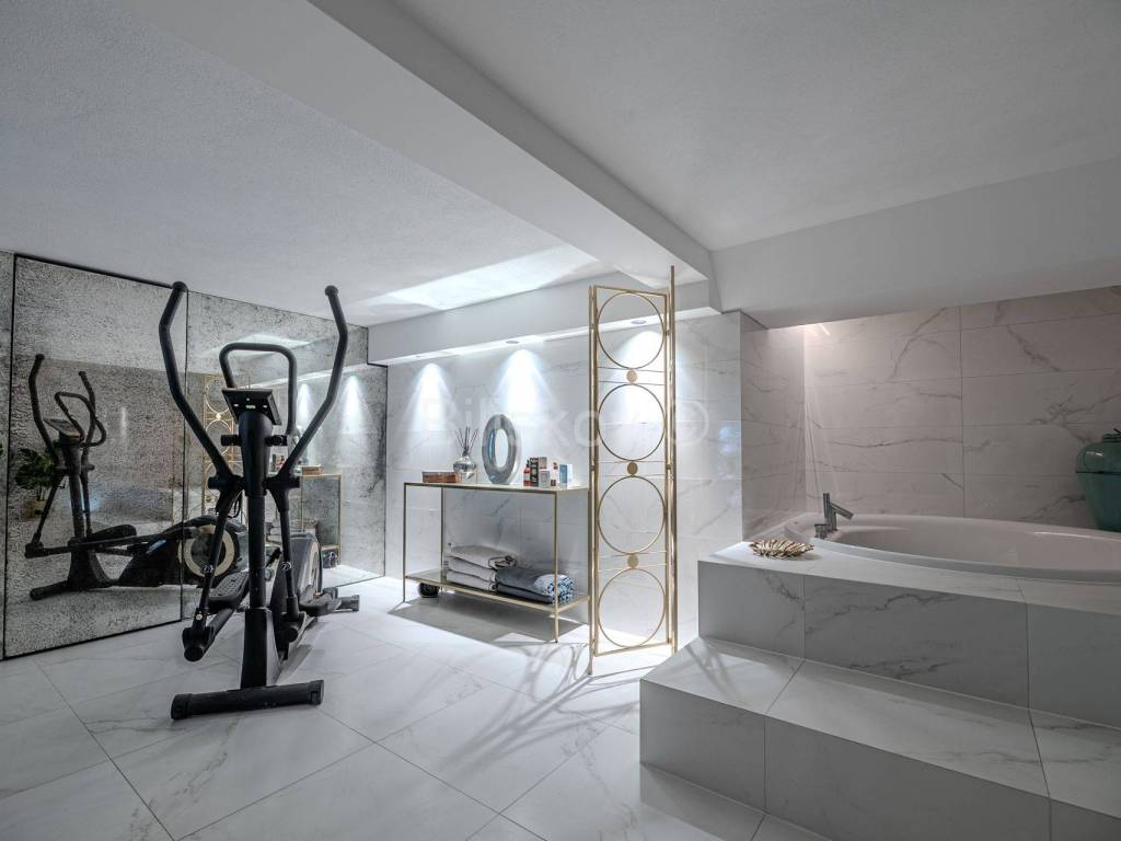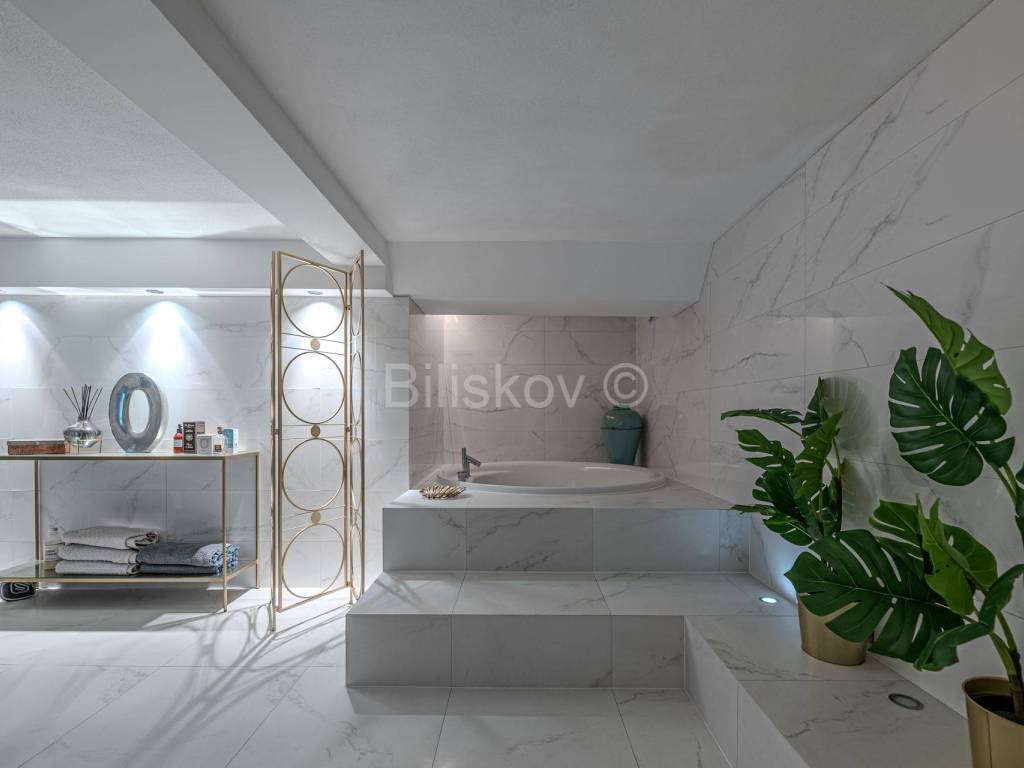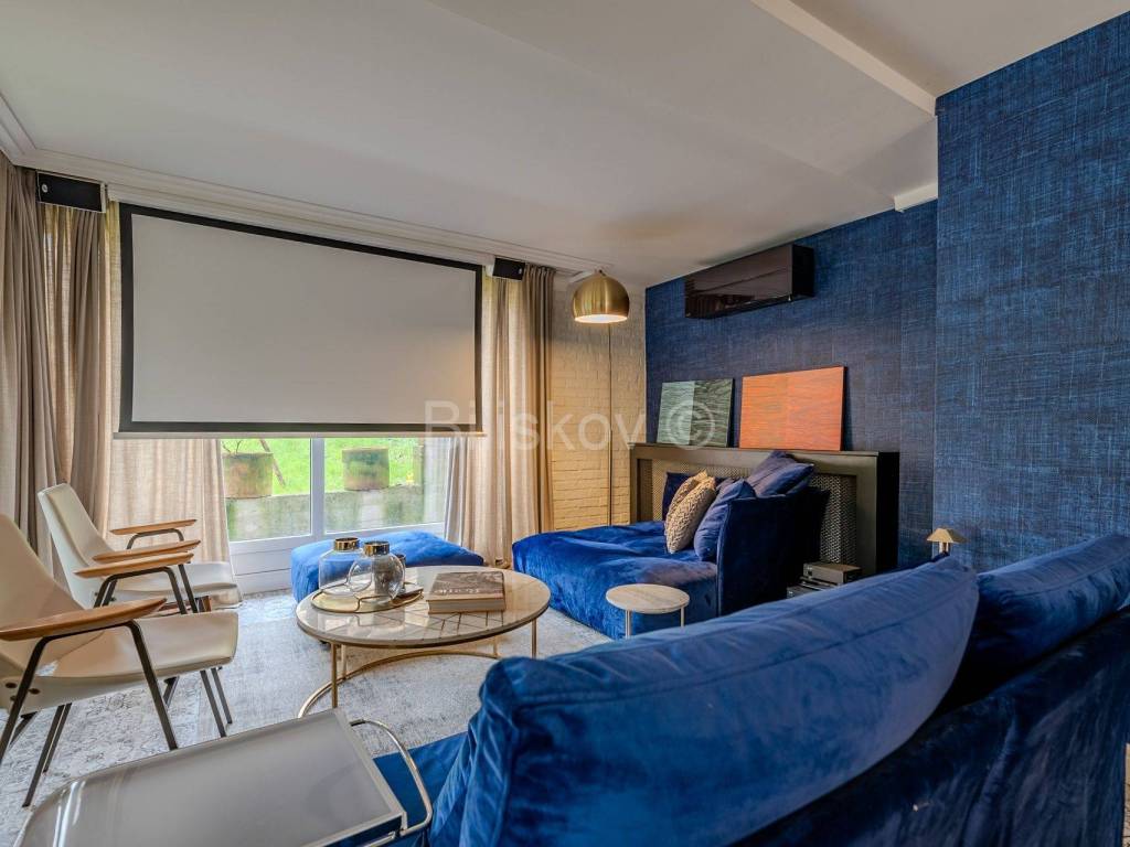The ground floor has a separate entrance and features a modernly designed, glass-enclosed space with a beautiful view of the greenery, suitable for business use as well. This area includes a home cinema, a dining and gathering space for 14 people, a large bathroom with a jacuzzi and a small gym, as well as a storage room.