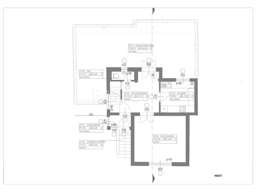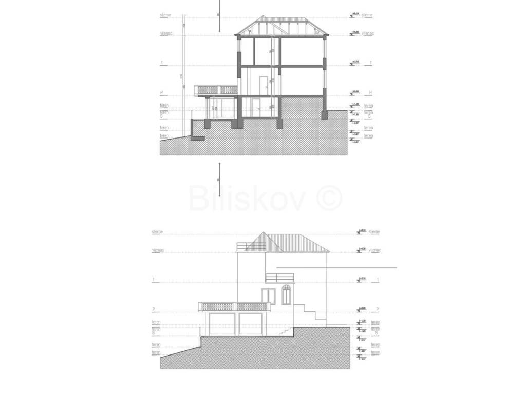 The upper ground floor represents the second part of the house, arranged in a classic style. It consists of an entrance hall, a dining room with access to a spacious 60 m terrace overlooking the forest, a separate kitchen, a large living room with a library, and a small guest WC. From the dining room, stairs lead to the first floor, which contains the sleeping quarters with two bedrooms, a bathroom, and a small terrace.