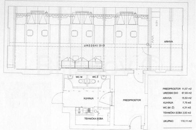Lijep poslovni prostor, površine 110,11m2, u potkrovlju zgrade, koja je građena za vrijeme secesijskog modernizma. Prostor se sastoji od: predprostora, uredskog dijela koji je površine 67m2, arhive, tehničke sobe, kuhinje i muskog i ženskog WC. Oprema i završna obrada prostorija u potpunosti je suvremena, uz očuvanje duha originalnog prostora.Temeljitom rekonstrukcijom objektu je vraćen izvorni prostorni i oblikovni dignitet. Obnovljena je bogata plastika objekta, stilski detalji bravarije i stolarije, originalni vitraji, stropne štukature i kaljeve peći.
