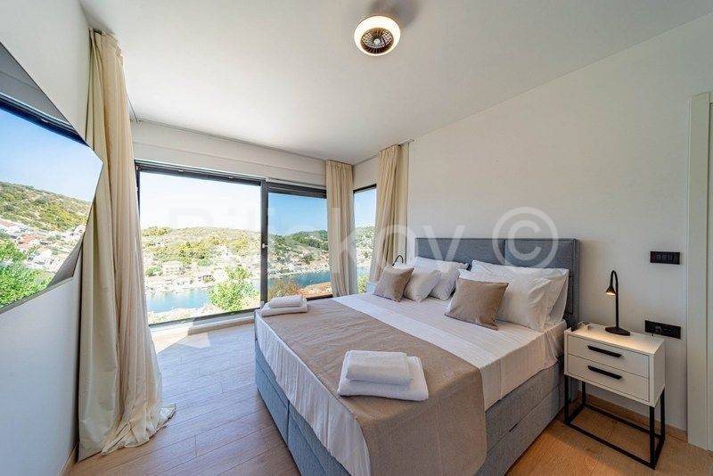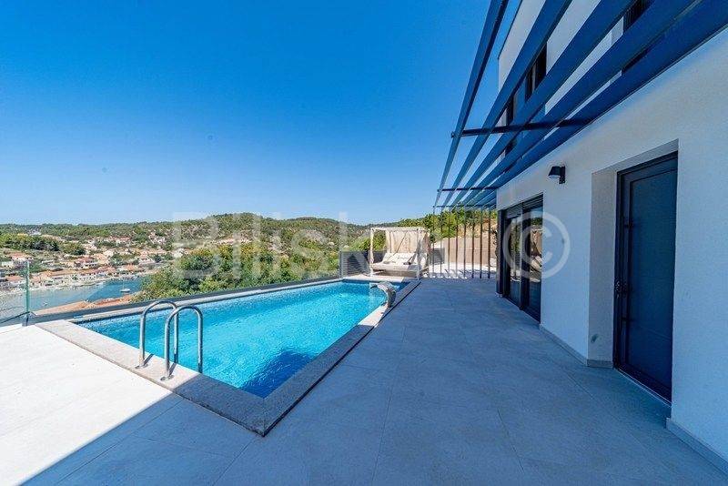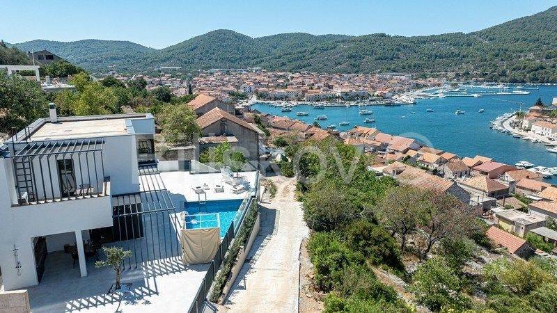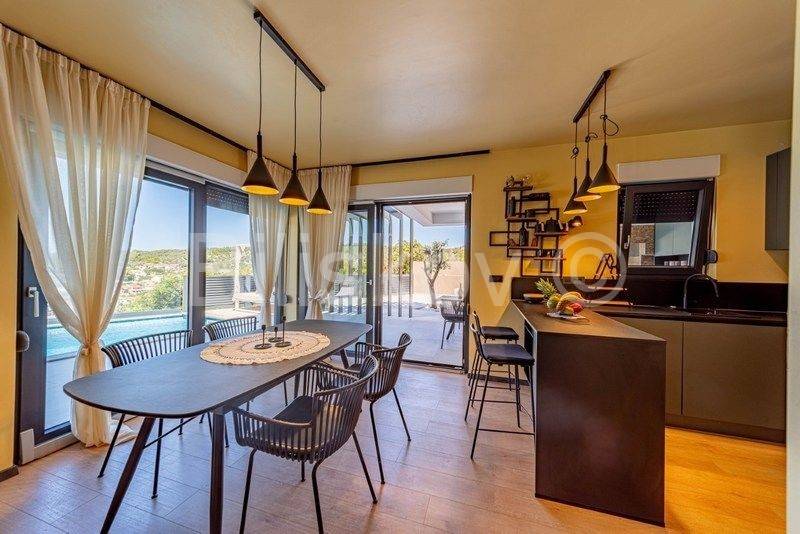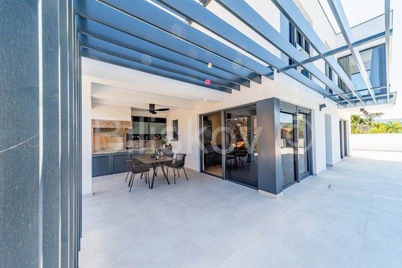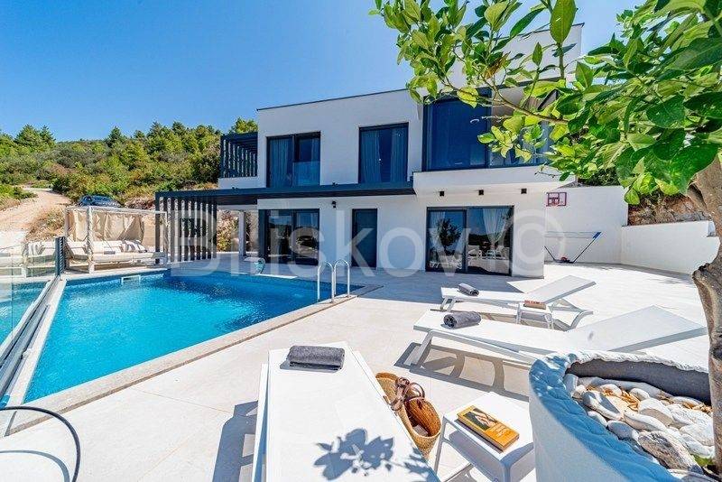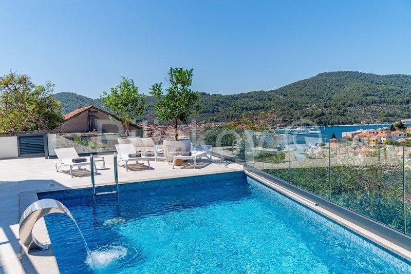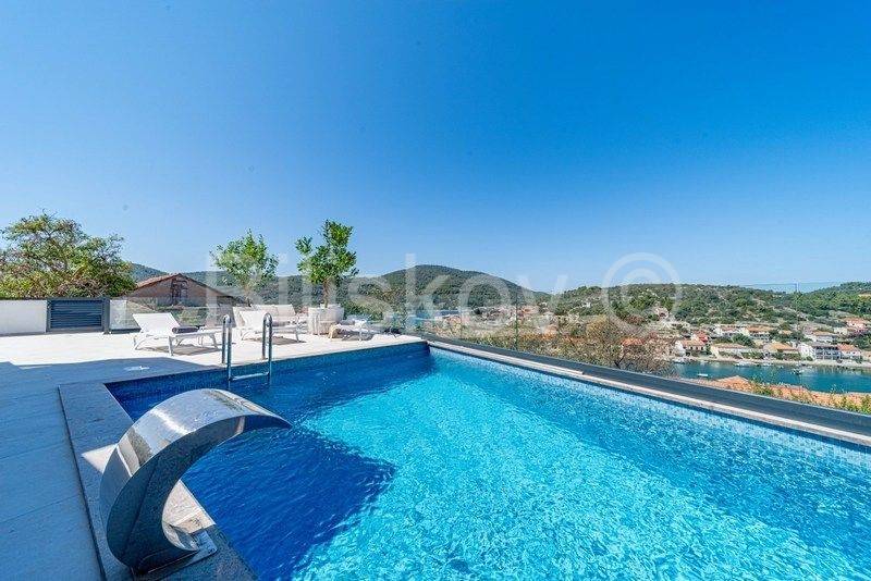 Korčula, Vela Luka, modern villa in a quiet location, a few minutes' walk from the center and all facilities. The living area of the villa on two floors is 120 m2, covered terrace with barbecue 25 m2, terrace from the western bedroom 14 m2, outdoor terrace with swimming pool 200 m2, area of the plot is 770 m2.