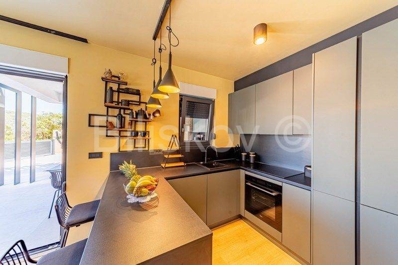 On the ground floor there is a kitchen with a dining room and a living room, a toilet, an outdoor covered kitchen with a grill and a table. Large glass walls along the entire length of the living room and dining room allow an open view of the bay, the pool and the large terrace. There is a modern fireplace in the living room. There is a "playground" area on the side of the house.
