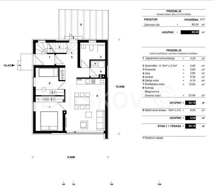 www.biliskov.com ID: 14397Trešnjevka north, RudešA three-room apartment of 72.6 m2 is for sale on the ground floor of a new building whose completion is expected in September 2024.The apartment consists of a hallway, an "open space" living room with a kitchen and a dining room, two bedrooms, a bathroom with a toilet, a utility room, a covered terrace, a garden (hidden from the view of the neighbors ensures privacy and peace) and a storage room.The apartment also has an outdoor parking space.The building is located in an extremely sought-after location, close to all amenities necessary for a quality and fulfilling life, such as public transport (300 m), elementary school (300 m), kindergarten (300 m), health center and pharmacy (50 m), Lake Jarun (1500 m), shops, restaurants, cafes...The property is tidy.Energy class: A+Carpentry: PVC with electric shutter lifters and mosquito netsHeating: Heat pump with thermostat for temperature regulation in each roomPrice: 297,660Agency fee for the buyer: 2% + VAT of the achieved purchase price.
