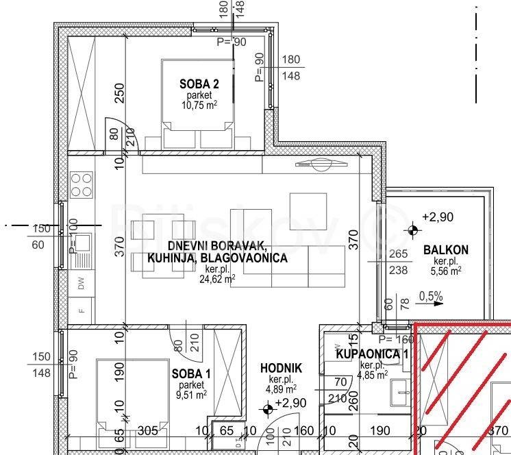 Three-room apartment with a closed area of 62.08m2 on the ground floor of a building built in 2024.