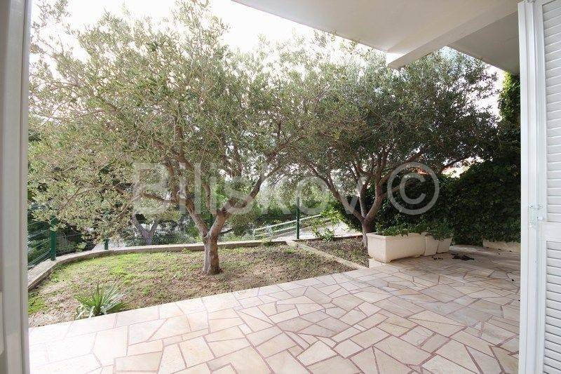 The living room leads to a large terrace in front of which is a garden with olive trees and Mediterranean plants. From the kitchen, there is a hallway that leads to two bathrooms with a toilet and a shower, an entrance hall and two bedrooms that have access to either the balcony or the covered porch. On the south side is another spacious room that is used as a study and also has access to a covered terrace on the south side of the house.