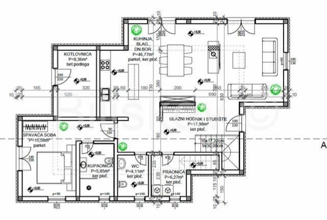 On the ground floor there is a spacious entrance area and staircase (17.11 m2), kitchen, dining room and living room (46.77 m2), bedroom (15.58 m2), bathroom (5.85), toilet (4.11 m2). , laundry room (6.27 m2),boiler room (8.36 m2).