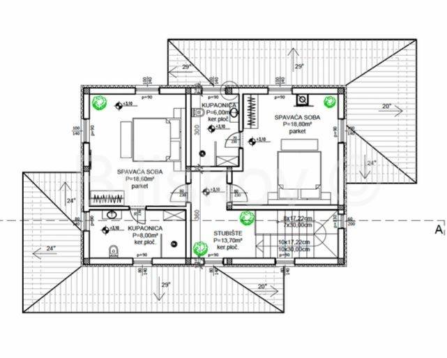 On the first floor there is a staircase that occupies 14.60 m2, two bathrooms (8 and 6 m2) and two bedroomsrooms (18.60 and 18.80 m2).