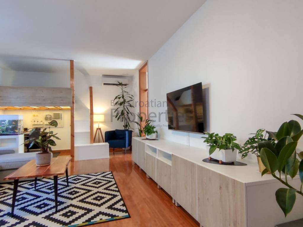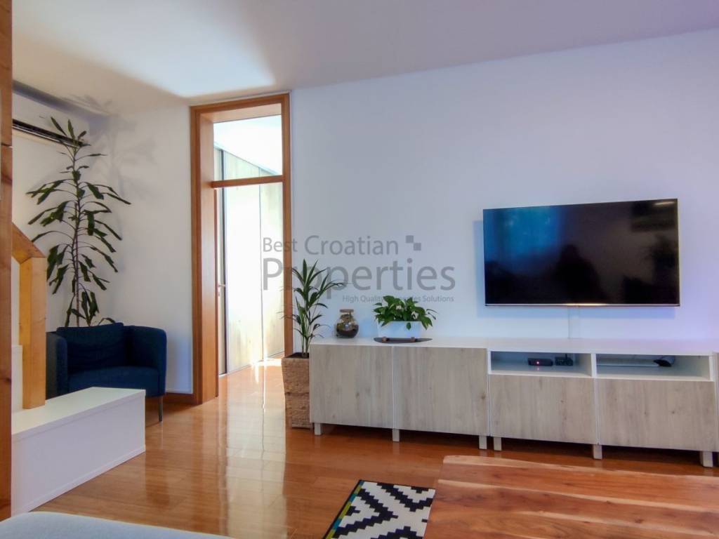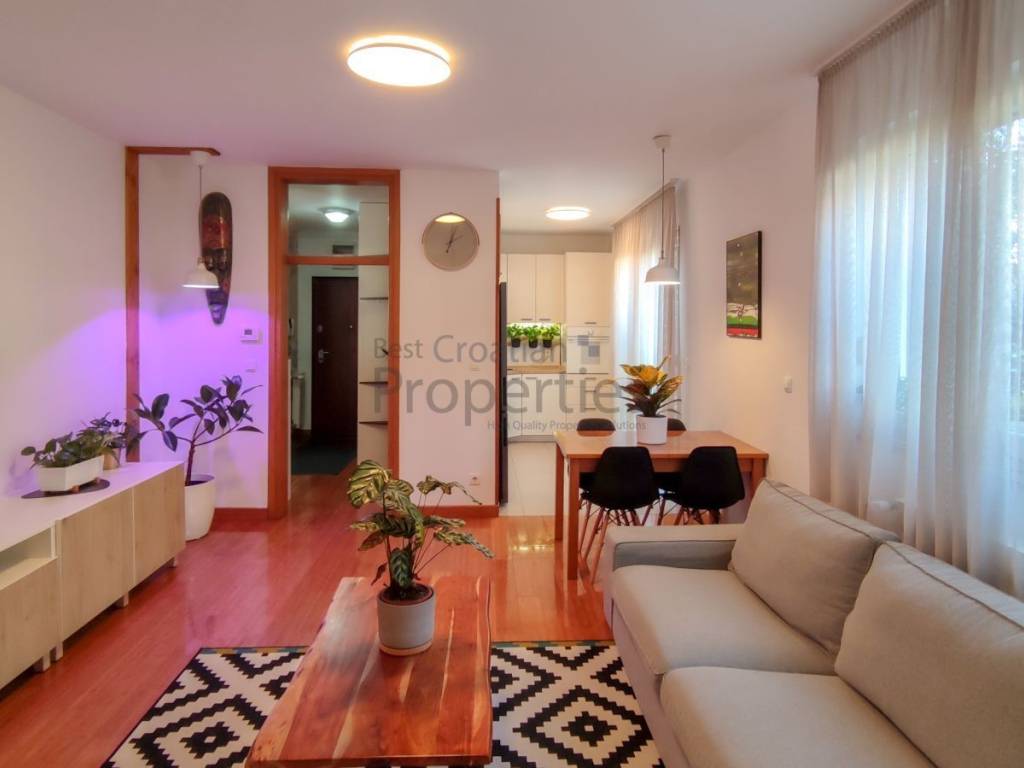 Sastoji se od hodnika, dnevne sobe, dvije spavaće sobe, kuhinje i blagovaonice, terase, vrta i spremišta. Stan posjeduje vanjsko parkirno mjesto.